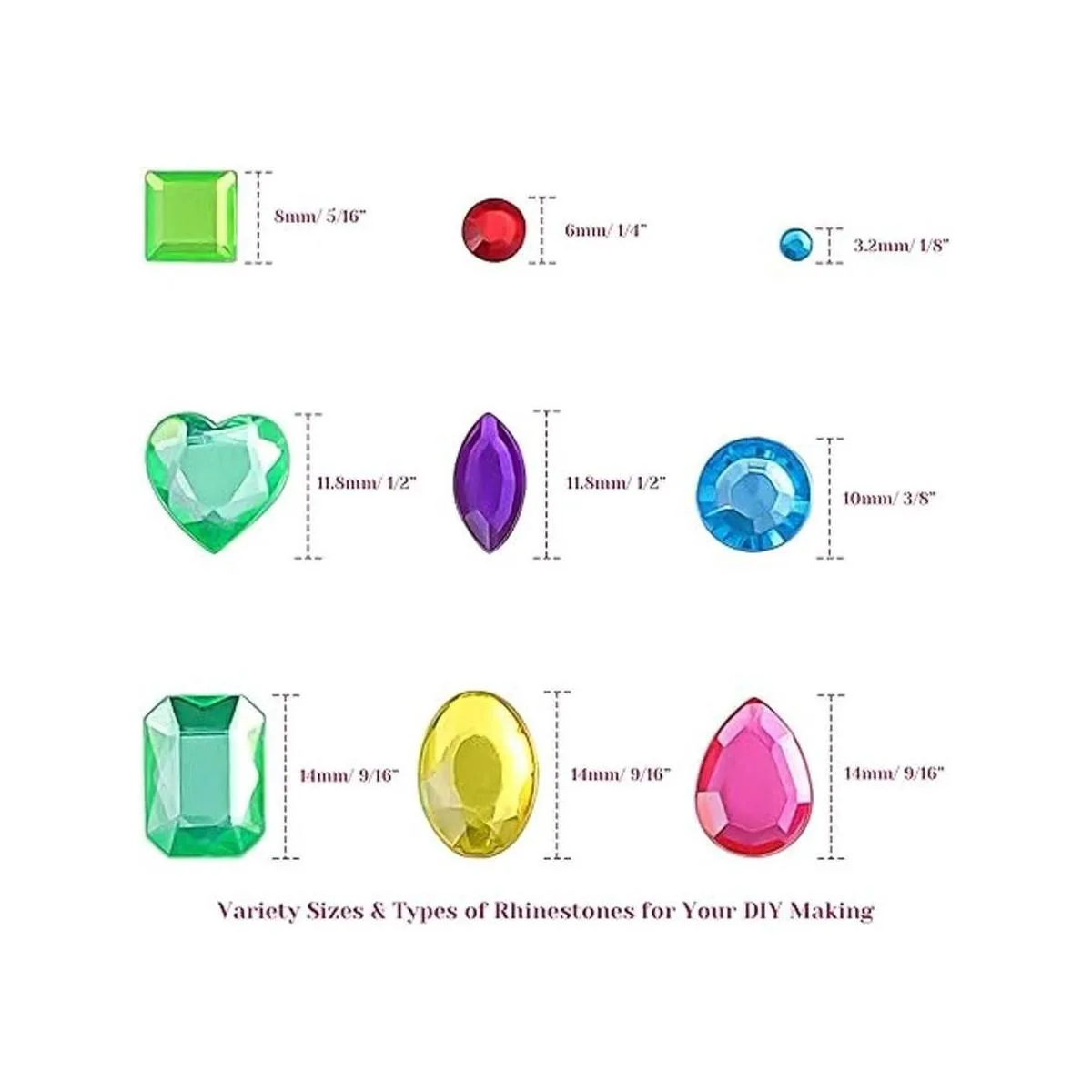 Varios tamaños y formas múltiples: estas gemas te proporcionan una buena selección de formas a tamaños. Incluyen gemas redondas de diferentes tamaños, joyas cuadradas, formas de corazón, diamantes de imitación rectangulares, cristales ovalados, piedras preciosas en forma de gota y calcomanías de perlas de ojo de caballo