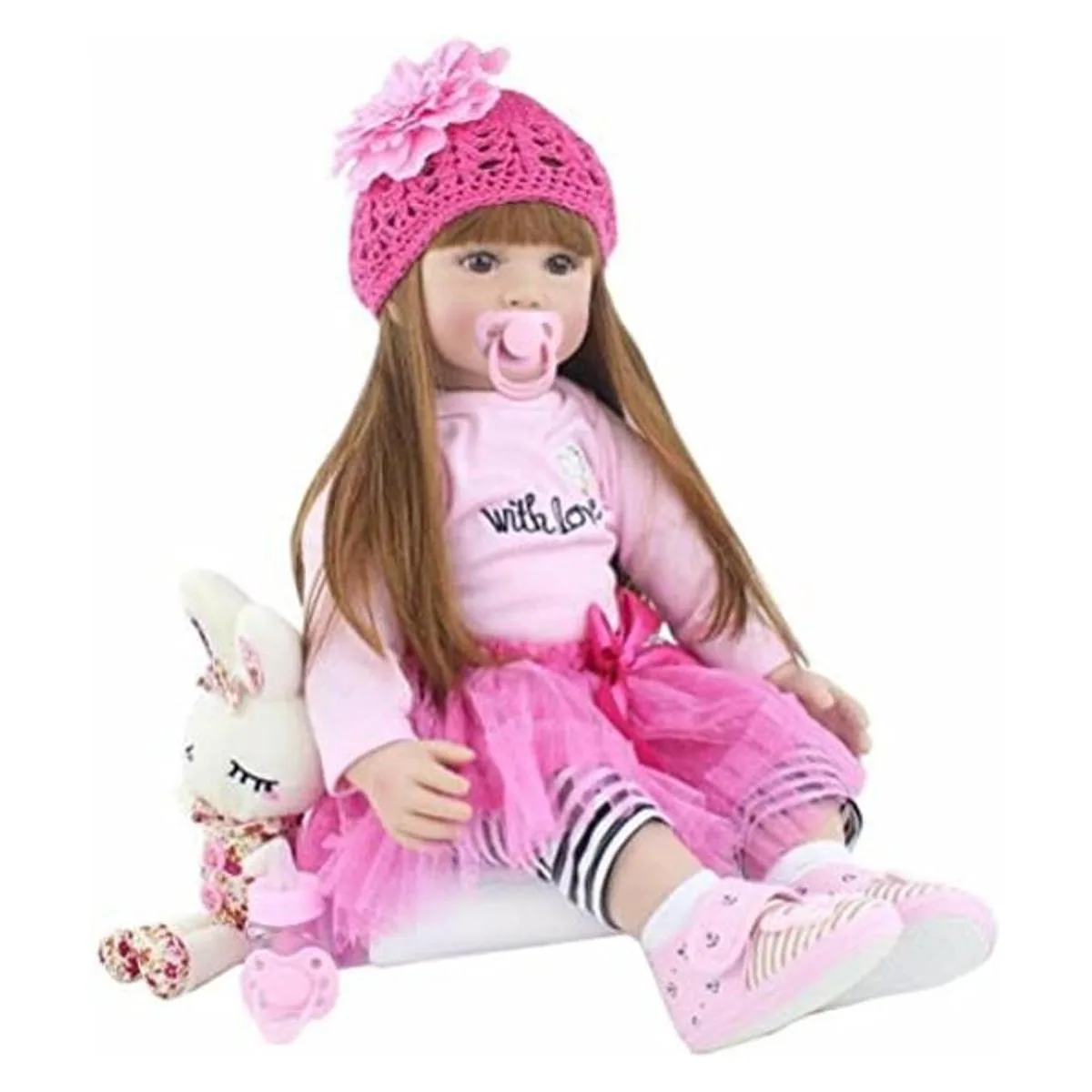 Recibirás: 1 muñeca de bebé, 1 certificado de nacimiento, 1 ropa como imágenes, 1 chupete magnético, 1 muñeca que puede llevar ropa de bebé real a los 3 meses.