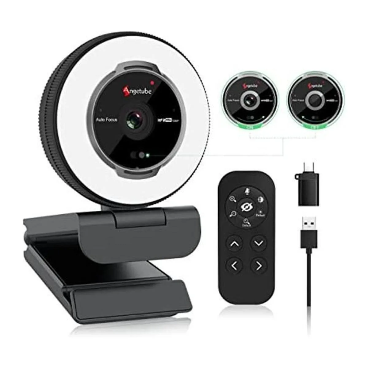 Angetube Cámara web de transmisión con micrófono cámara web USB 1080P 60FPS con anillo de luz y control remoto, cámara web HD con zoom digital 5X, cubierta de privacidad integrada, para PC, computadora, laptop, Mac, escritorio