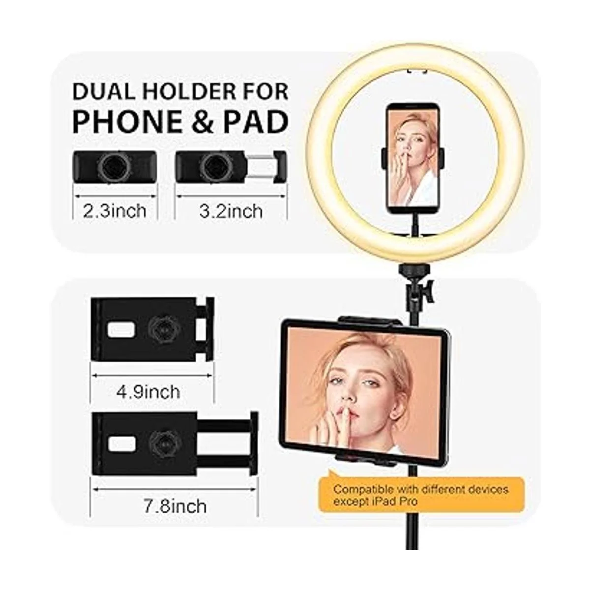 Soporte para tableta/teléfono 2 en 1 y giratorio de 360: la luz del anillo OStudio está equipada con un soporte multifuncional antideslizante desmontable, que se puede expandir a 7.8 pulgadas. Anillo de luz con soporte y soporte para teléfono compatible con el uso simultáneo de 2 teléfonos o teléfonos tableta, te ofrece más opciones. Adecuado para transmisión en vivo, maquillaje, videoconferencia y grabación de video, etc