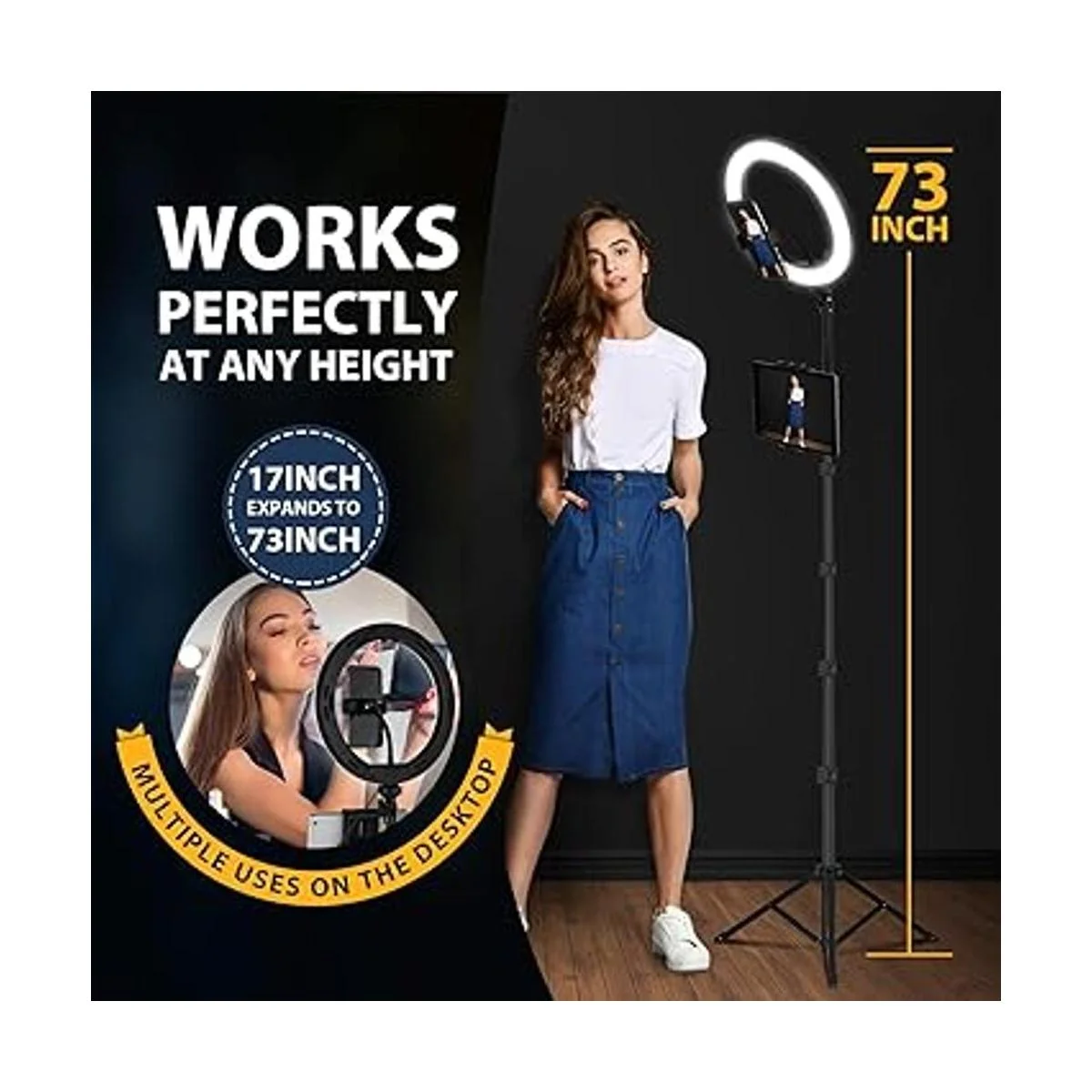 Soporte de trípode más alto y resistente de 73 pulgadas La luz de anillo de altura ajustable de 73 pulgadas es más larga que otras. El material de aluminio hace que la posición sea segura y resistente. Trípode ajustable de fácil bloqueo que también se puede utilizar como un palo para selfies, soporte para teléfono y soporte para cámara. La capacidad de carga máxima es de 11.0 lbs