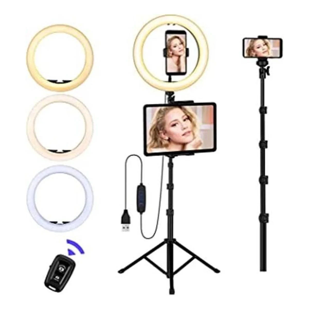 Anillo de luz con soporte y soporte para teléfono, luz LED de 10 pulgadas con trípode 1773 pulgadas Bluetooth remoto para iPadtabletgrabación de video, transmisión en vivo, maquillaje, YouTubefotografía, 3 modos de color