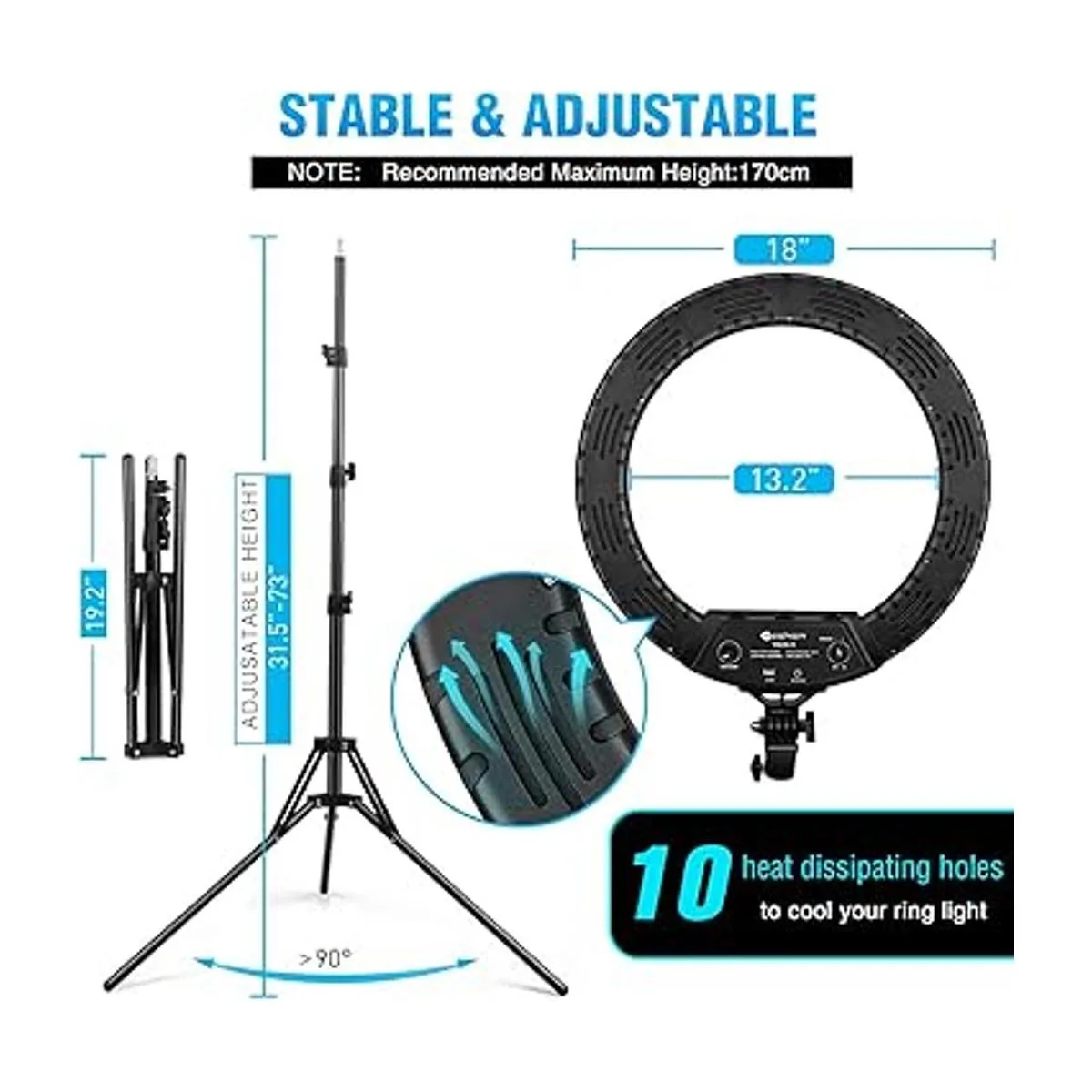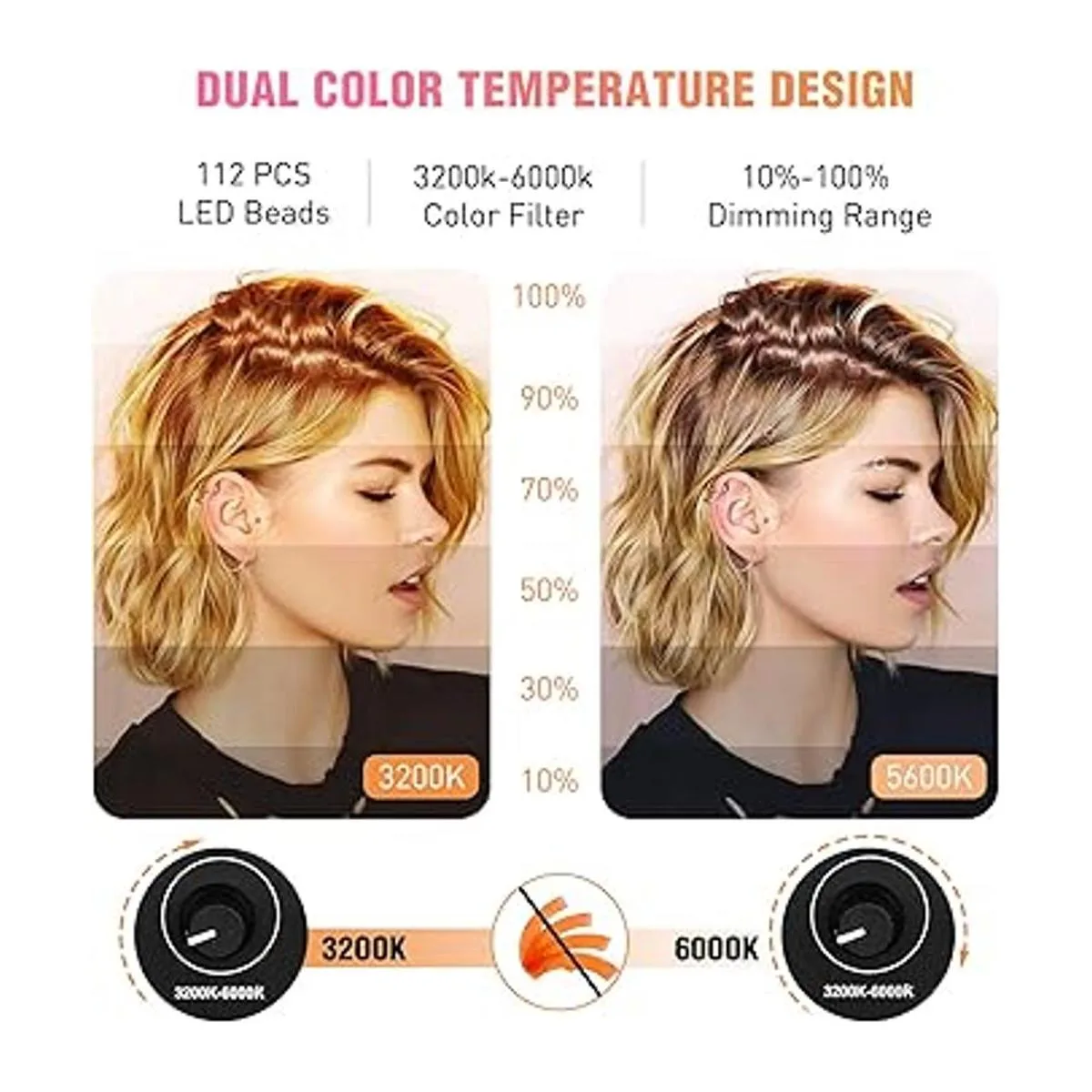 Cambio de color inteligente y rápido: La luz se controla mediante un mando giratorio que está en el soporte. Ajusta fácilmente la temperatura del color entre 3000 y 6000 K sin utilizar filtros de color. El anillo de luz tiene un amplio rango de atenuación de brillo, desde el 10 al 100 . Obtén una luz fría o cálida para ocultar tus imperfecciones y cambiar tu tono de piel rápida y fácilmente. Y sus 12 agujeros disipadores de calor pueden enfriar la luz de tu anillo, lo que prolongará la vida útil del producto.