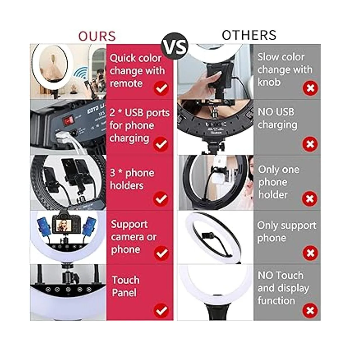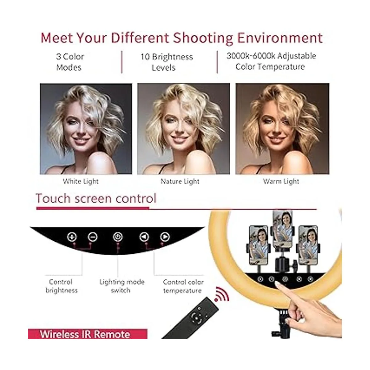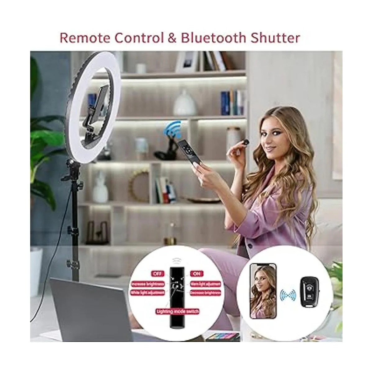 Anillo de luz grande mejorado de 18 pulgadas: diseño especial LED SMD que emite una gran luz que va desde 2900 K a 6500 K temperatura de color sin cambiar el filtro de color, 10 a 100 de brillo ajustable, lo suficientemente brillante, perfecto para retratos, vlog, transmisión en vivo y selfie. Equipado con voltaje global de 100240 V.