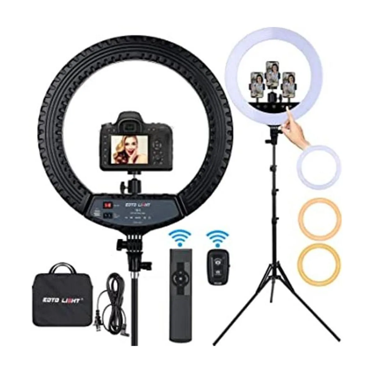 Lo que obtendrás: 1 anillo de luz LED de 18 pulgadas, 1 soporte de trípode de luz de anillo, 2 soportes ajustables para teléfono, 1 cabezal de trípode, 1 soporte para teléfono/cámara, 1 obturador Bluetooth, 1 control remoto IR, 1 cable de alimentación, 1 bolsa de transporte, 1 manual de usuario idioma español no garantizado. Garantía de 18 meses para o reemplazo.