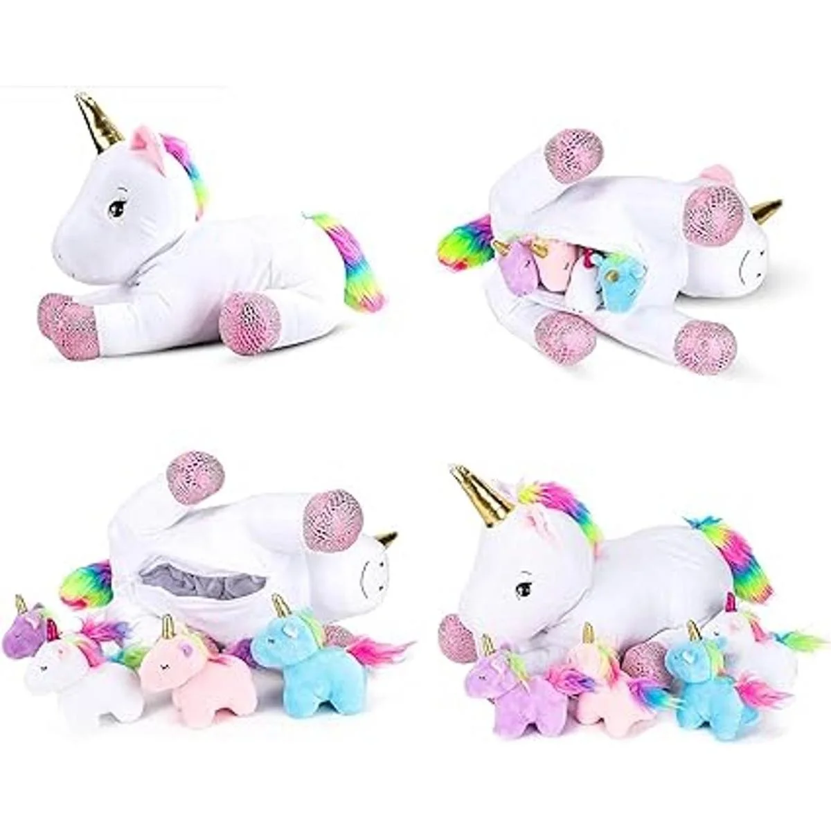 Animales de peluche de unicornio de 16 pulgadas, regalos de unicornio para niñas, 5 en 1, juego de unicornio de felpa con 4 bebés, unicornios, muñeca sorpresa