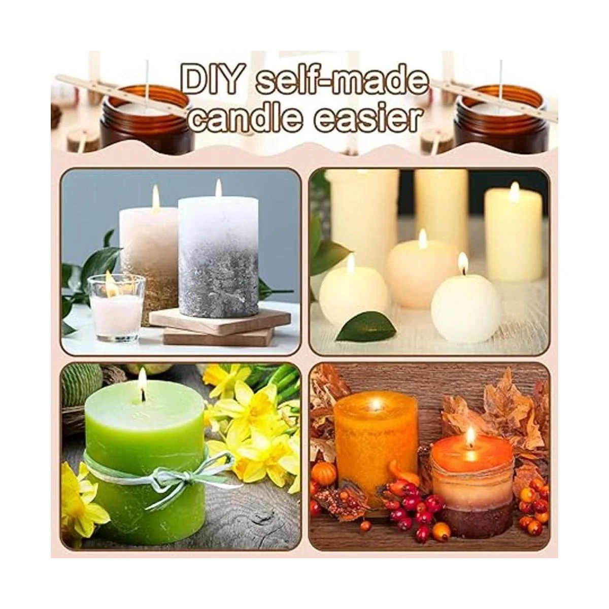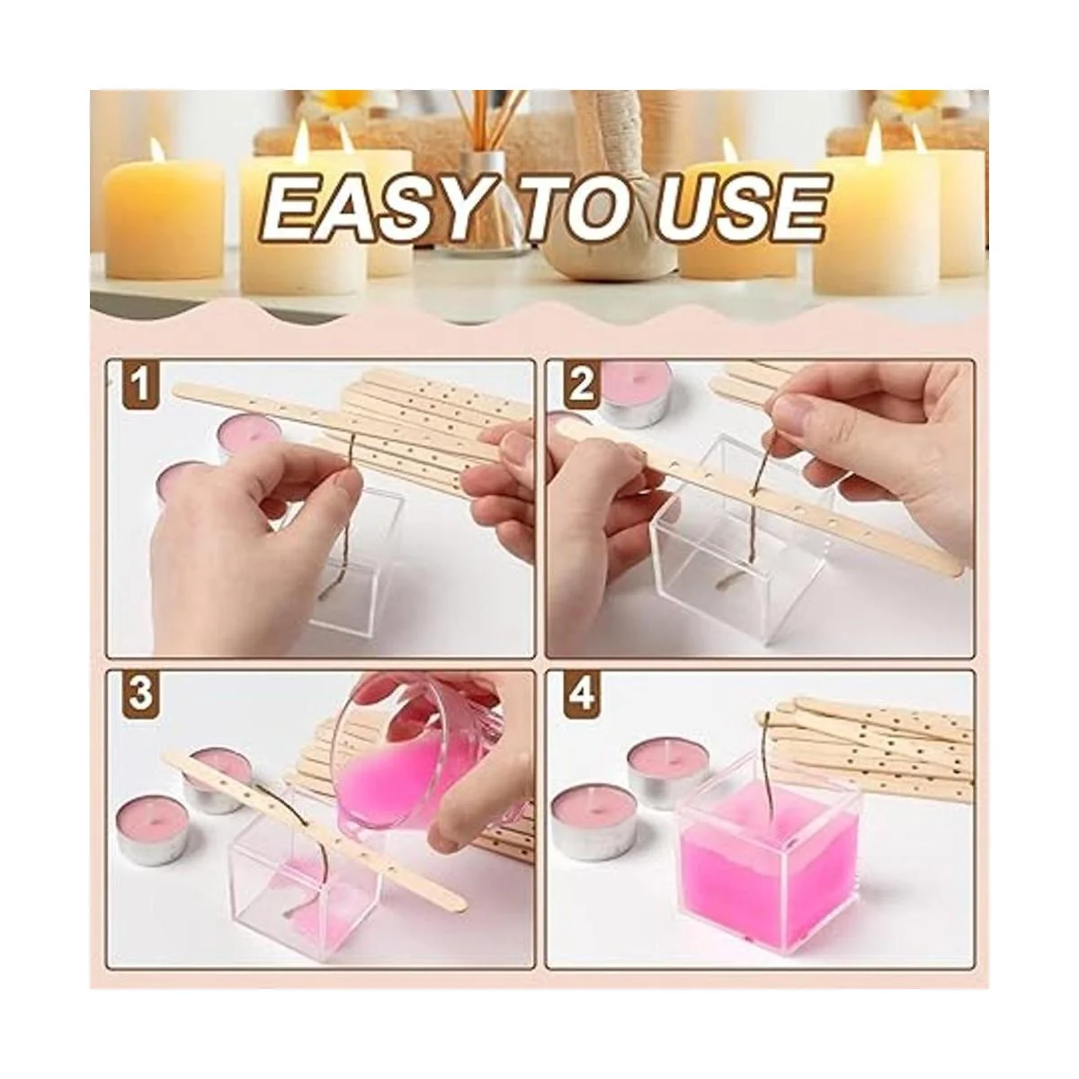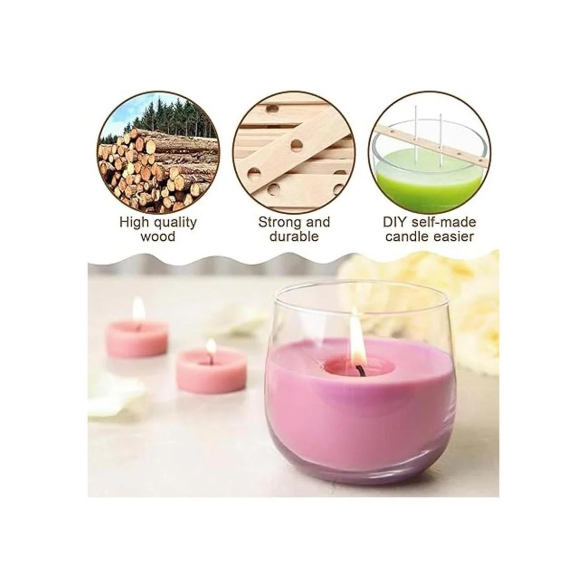 Fácil de usar: cuando la cera se solidifica, la mecha se puede colocar directamente en el recipiente. El portavelas de madera es adecuado para la mayoría de tipos de mecha y la mayoría de tamaños de recipiente, haciendo que tu vela sea más fácil.