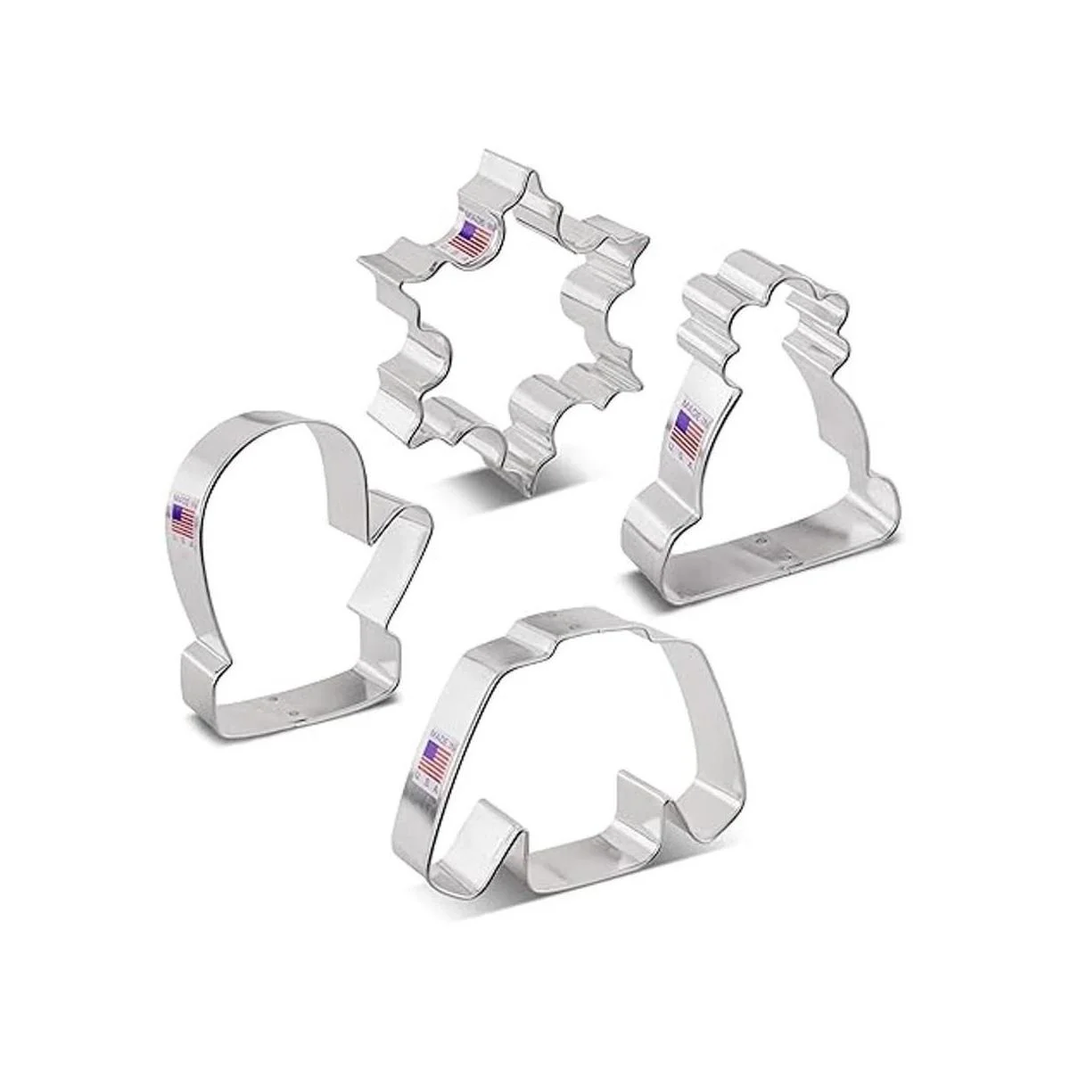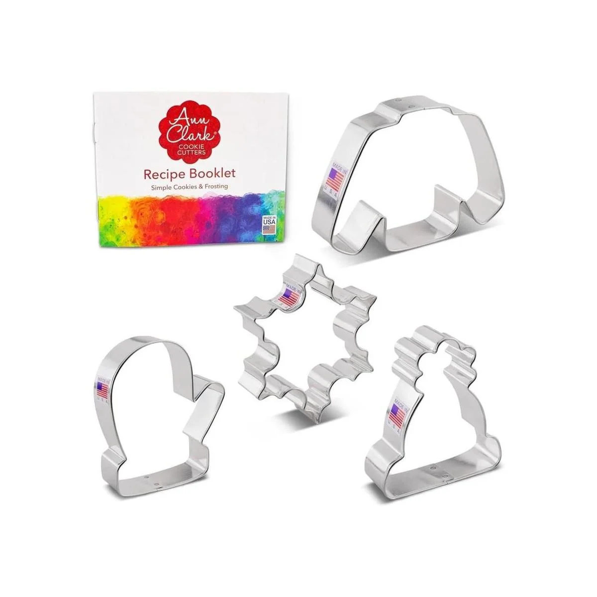 Ann Clark Cookie Cutters Juego de 4 piezas de cortador de galletas de invierno y Navidad con folleto de recetas, copo de nieve, suéter, guante y sombrero de invierno