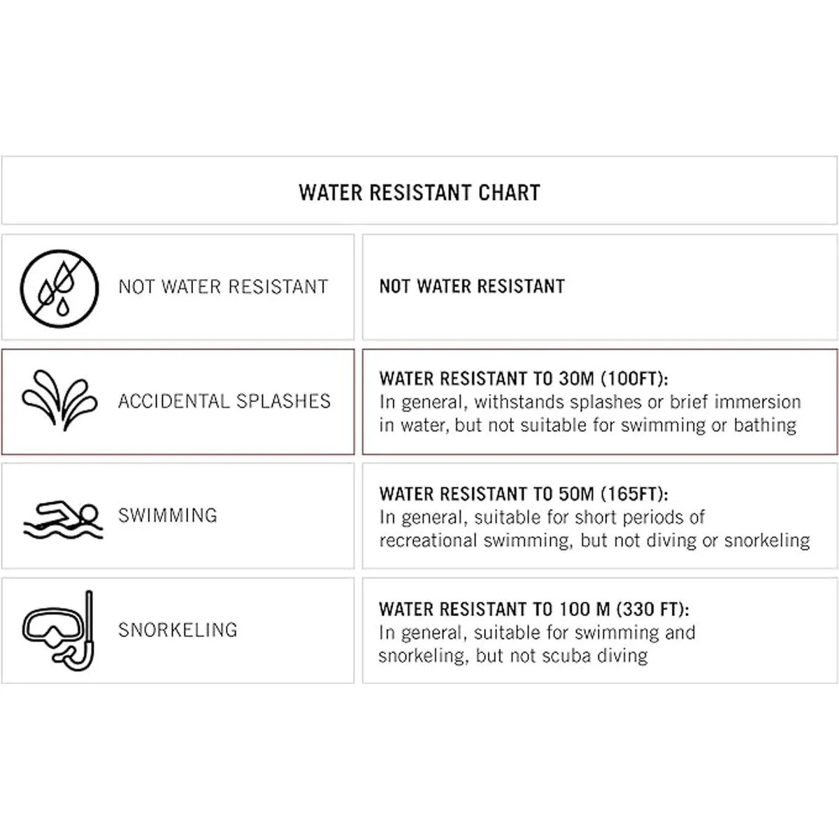 Resistente al agua hasta 30 m 100 pies: en general, resiste las salpicaduras o la inmersión breve en el agua, pero no apto para nadar o bañarse.