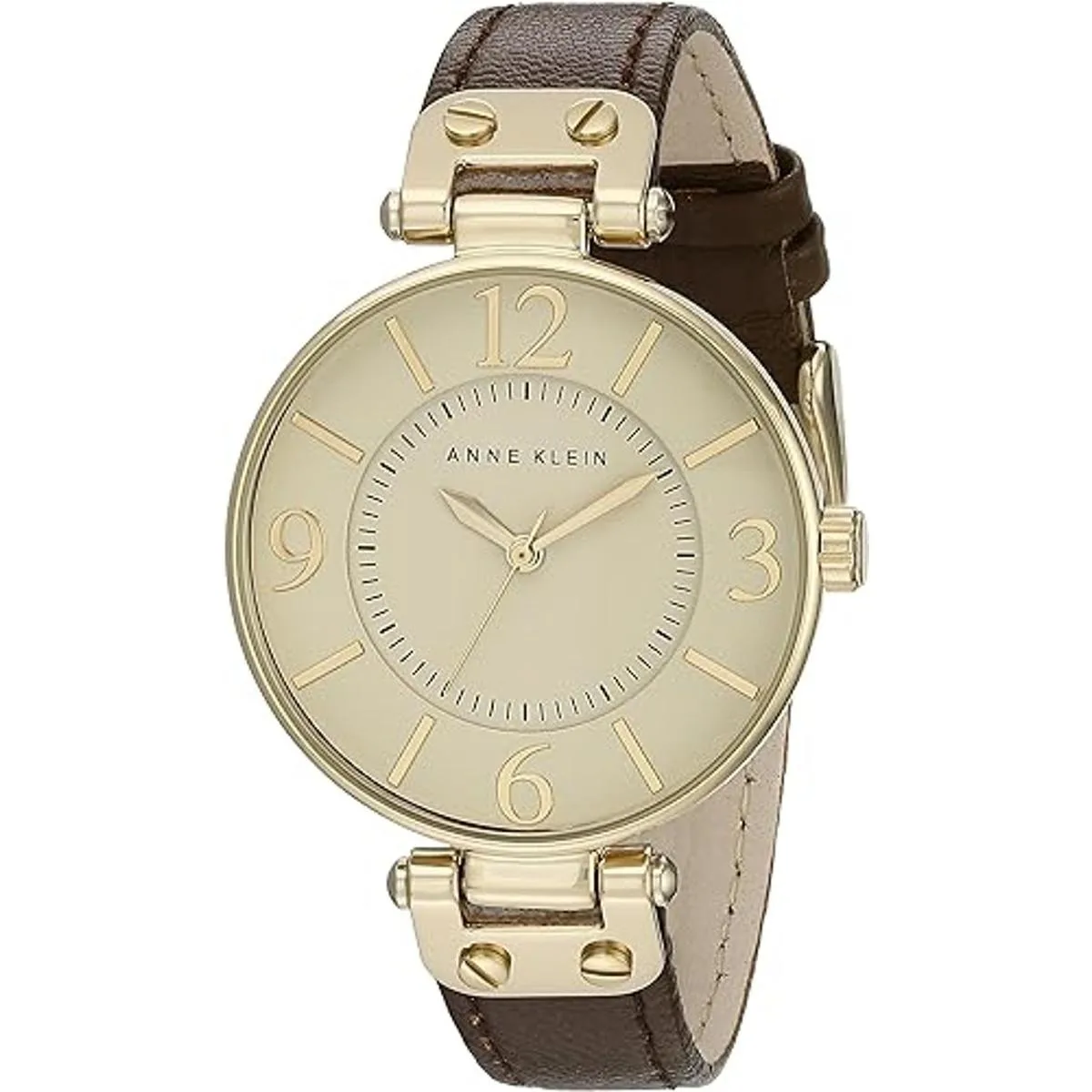 Esfera blanca mate con manecillas y marcadores dorados; pista exterior de minutos impresa en negro.