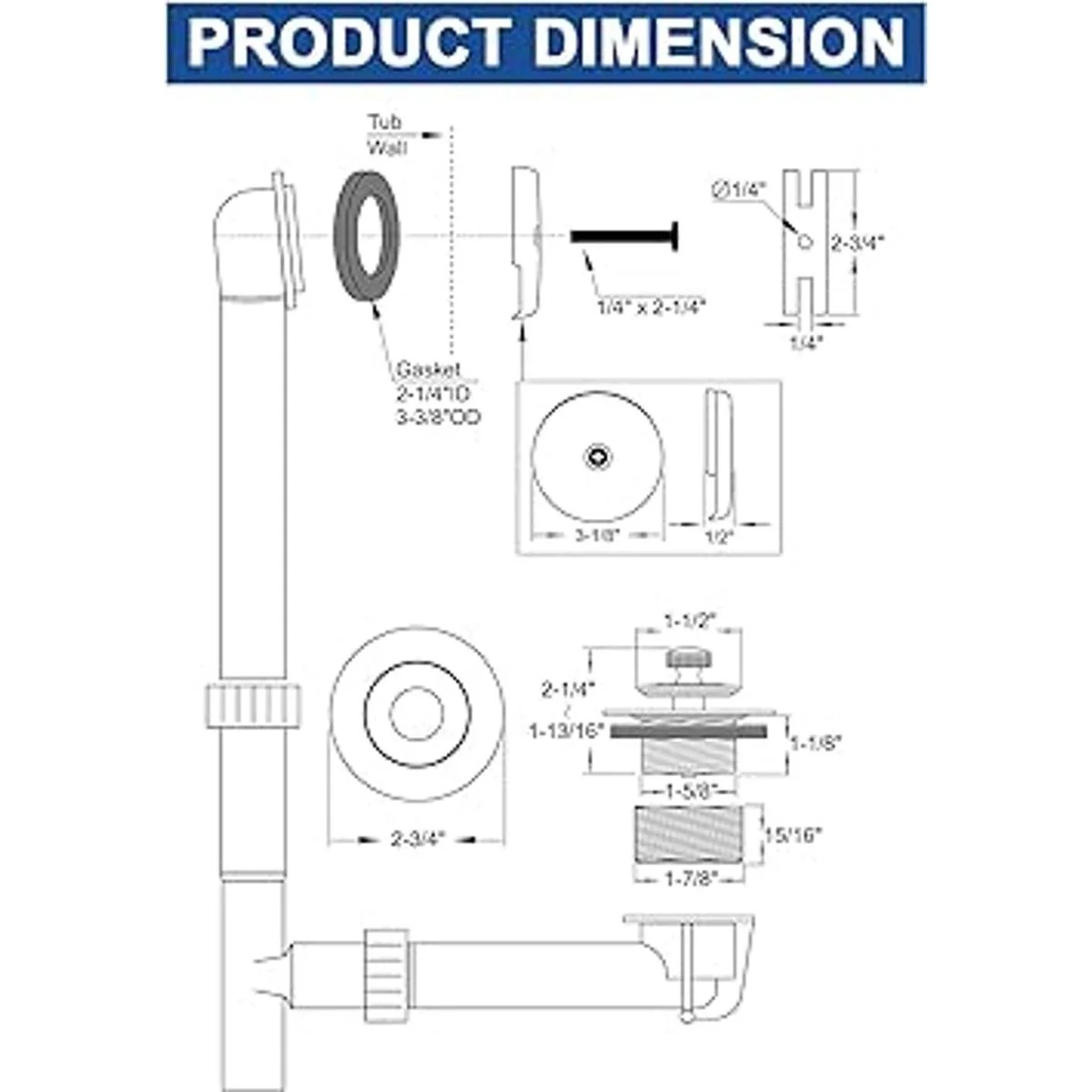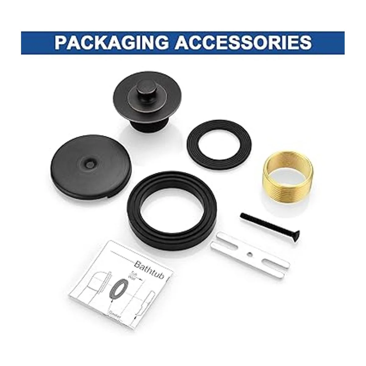 El paquete incluye: 1 placa frontal de desbordamiento de un solo orificio, 1 tapón de drenaje de bañera de 1.4 in de giro y cierre, 1 exterior de rosca gruesa de 1.7 pulgadas, 1 tornillo de placa frontal, 1 junta de goma, 1 manual de instalación.