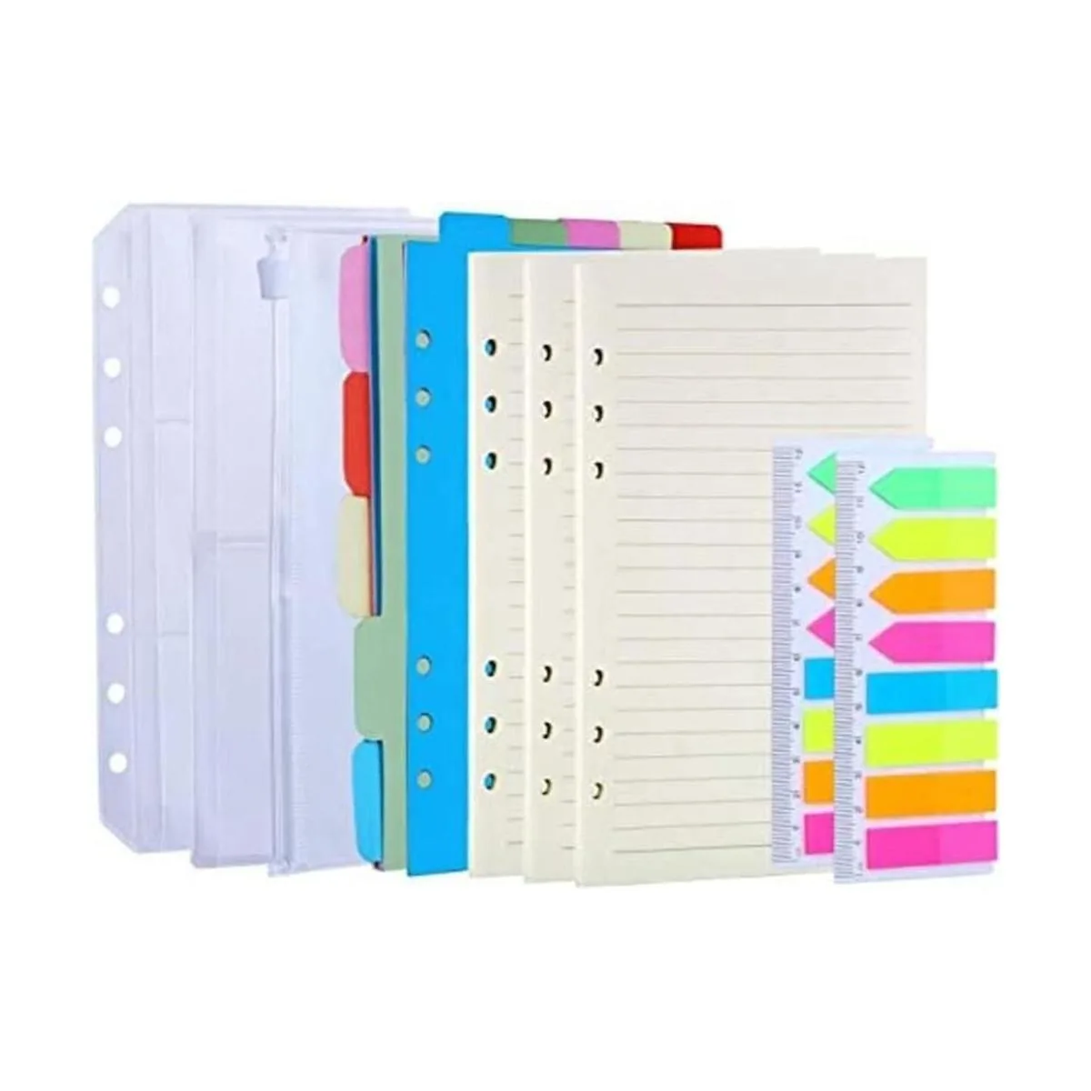 El paquete incluye: 135 hojas/270 páginas A6 papel de recambio de 6 agujeros, 3 bolsillos para carpeta, 2 pestañas de índice y 10 separadores de carpetas de color