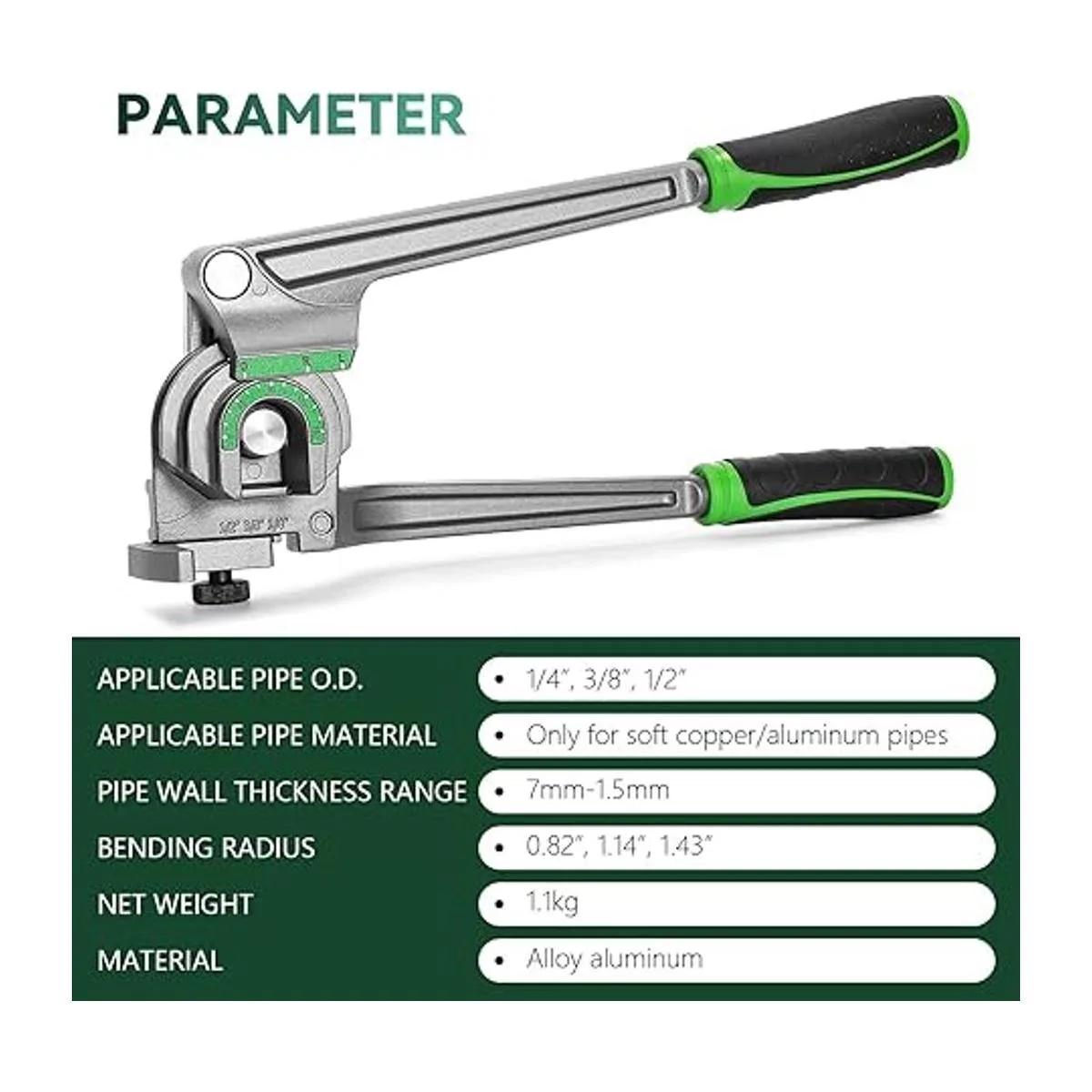 Parámetros: aplicación: solo para tubos de cobre/aluminio; diámetro exterior del tubo aplicable: 1/4, 3/8, 1/2; grosor de pared aplicable: 0.0270.0590.7mm1.5mm; radio de flexión: 0.82, 1.14, 1.430.827 in, 1.142 in, 1.437 in; ángulo de flexión: 0180.