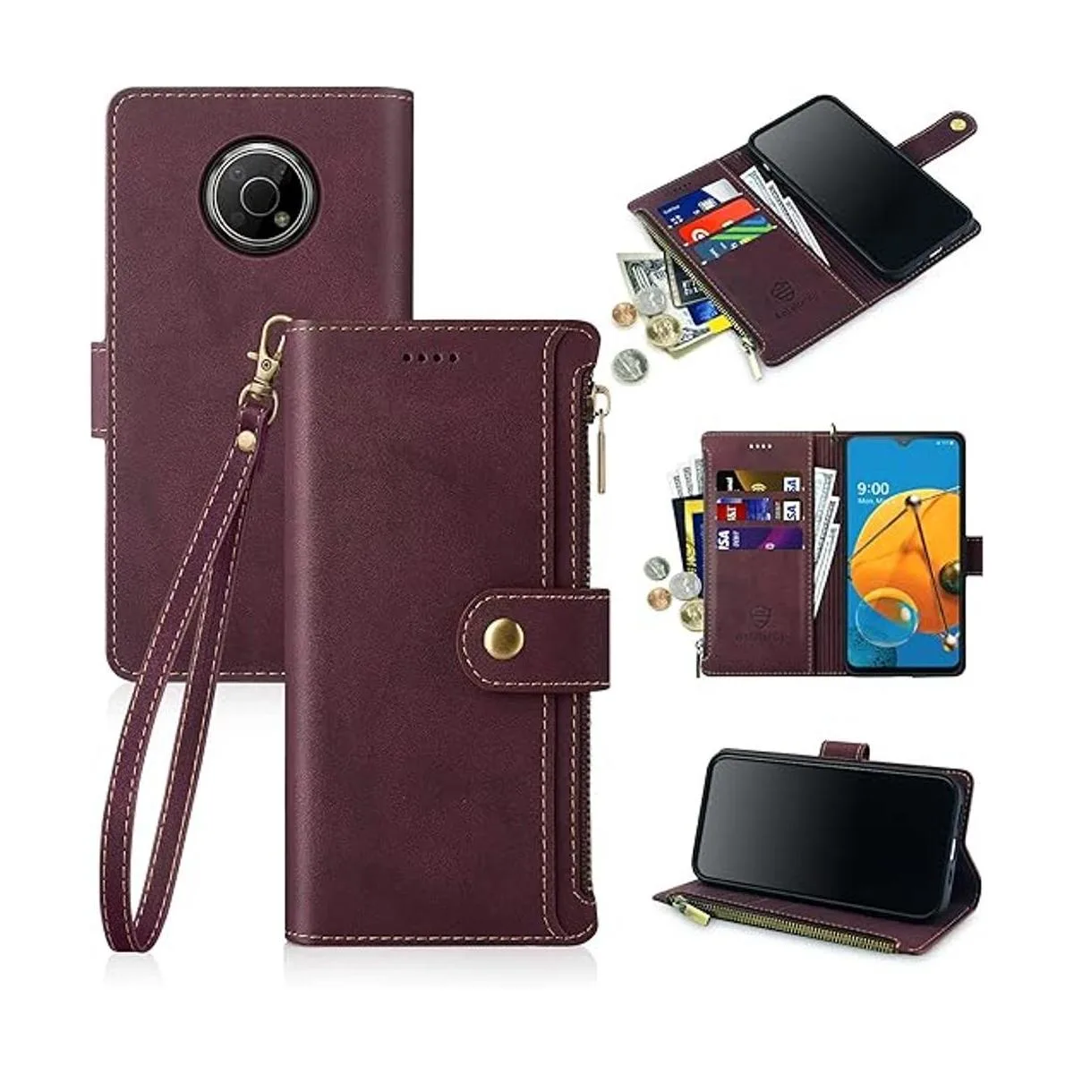 Antsturdy Funda tipo cartera para Nokia G300 5G bloqueo RFID cremallera Poket Funda protectora de piel sintética con correa para la muñeca, soporte para tarjetas de crédito, función atril, TPU a prueba de golpes, hombres y mujeres, rojo vino
