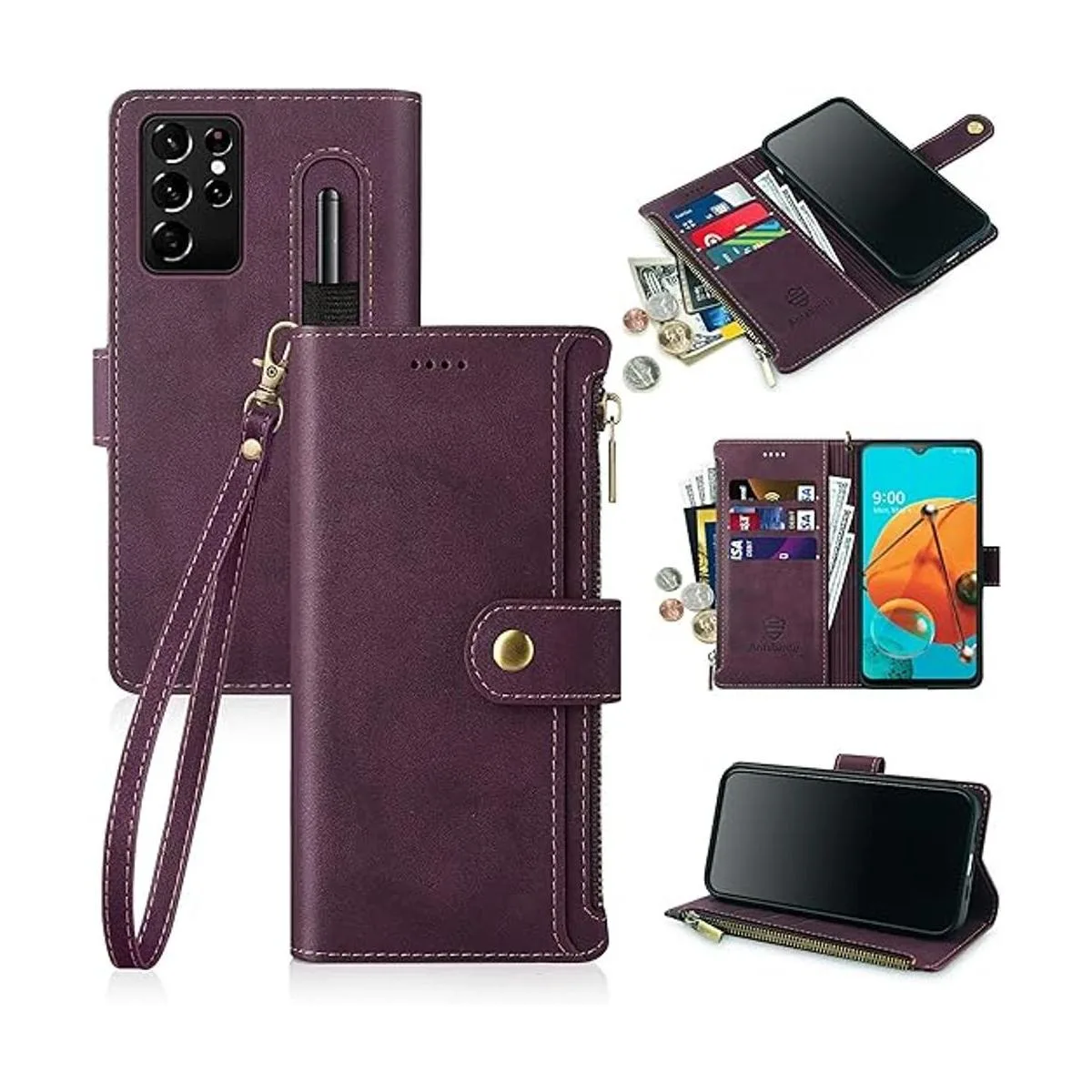 Antsturdy Funda tipo cartera para Samsung Galaxy S21 Ultra de 6.9 pulgadas con soporte para bolígrafo S, funda protectora de piel sintética, correa de muñeca bloqueo RFID Poket con cremallera Soporte para tarjeta de crédito, para hombres y mujeres, rojo vino
