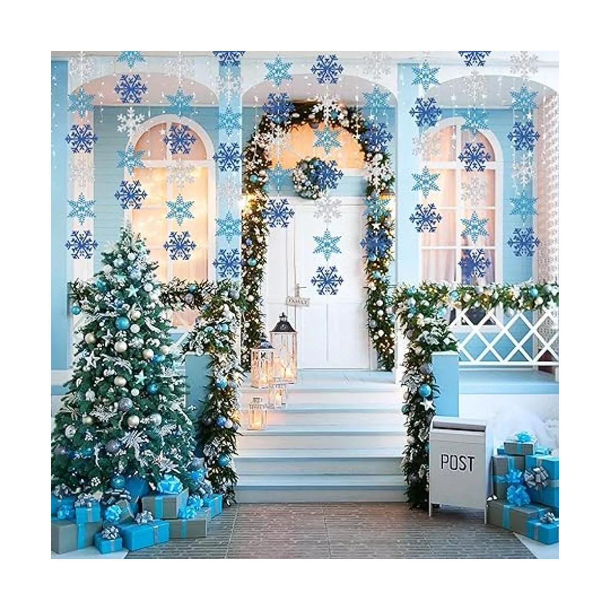 AnyDesign 54 guirnaldas de copos de nieve, decoraciones de copos de nieve colgantes con purpurina blanca y azul, pancarta de copo de nieve para Navidad, invierno, fiesta de país de las maravillas, decoración de cumpleaños