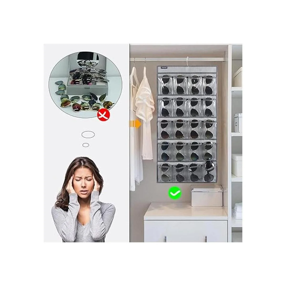 El organizador colgante de gafas de sol tiene 20 compartimentos transparentes con 5.1 pulgadas de alto x 3.9 pulgadas de ancho en cada lado, un total de 40 gafas se pueden sostener, conveniente y ahorra espacio. Ten en cuenta que el tamaño del bolsillo no es lo suficientemente grande como para sostener los lentes de sol, este producto está diseñado para deslizar una sien en lugar de todas las gafas en un bolsillo, las gafas se cuelgan fuera.