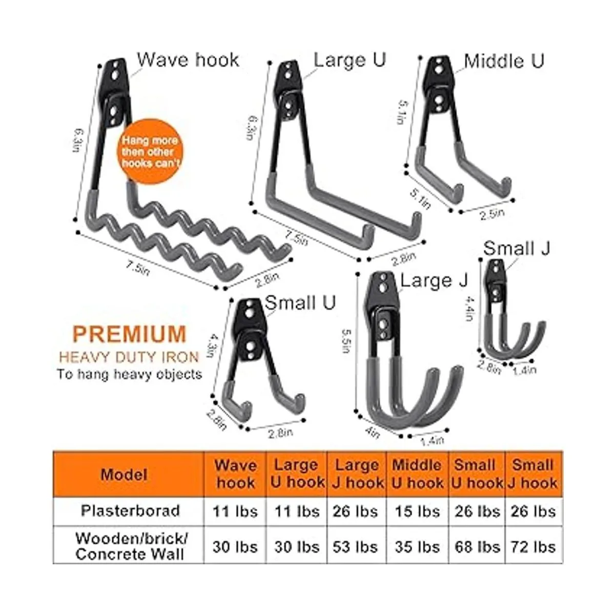 Ganchos de garaje resistentes para múltiples usos Ofrecemos 24 piezas, 6 tamaños diferentes de ganchos de garaje para diferentes usos: 8 ganchos en U pequeños, 4 ganchos en U medianos, 2 ganchos en U grandes, 6 ganchos en J pequeños, 2 ganchos en J grandes, 1 gancho ondulado, 1 correa. Diferentes tamaños para diferentes objetos y pesos. Realmente un organizador de garaje resistente para ti El colgador de herramientas Aoben es un gran organizador de pared de garaje y fácil de instalar.