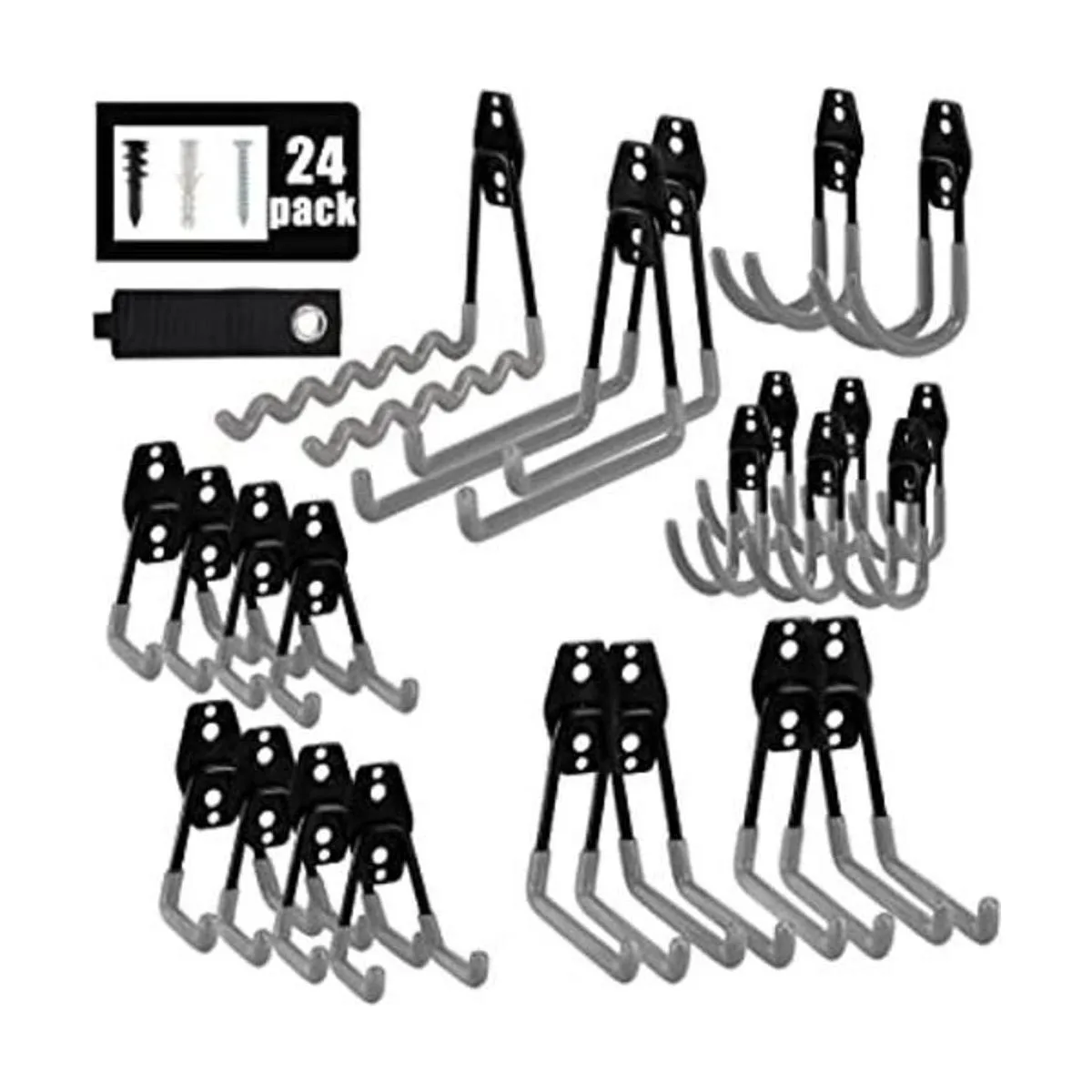 AOBEN Ganchos de garaje, 24 piezas resistentes organizadores de garaje antideslizantes de doble pared para escaleras, herramientas eléctricas, bicicletas, cuerdas 23 ganchos y 1 correa de hoder
