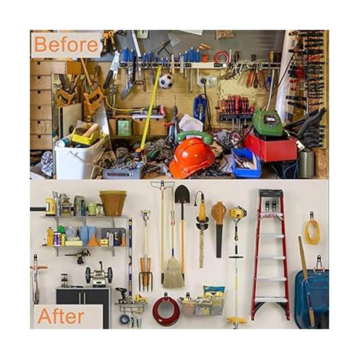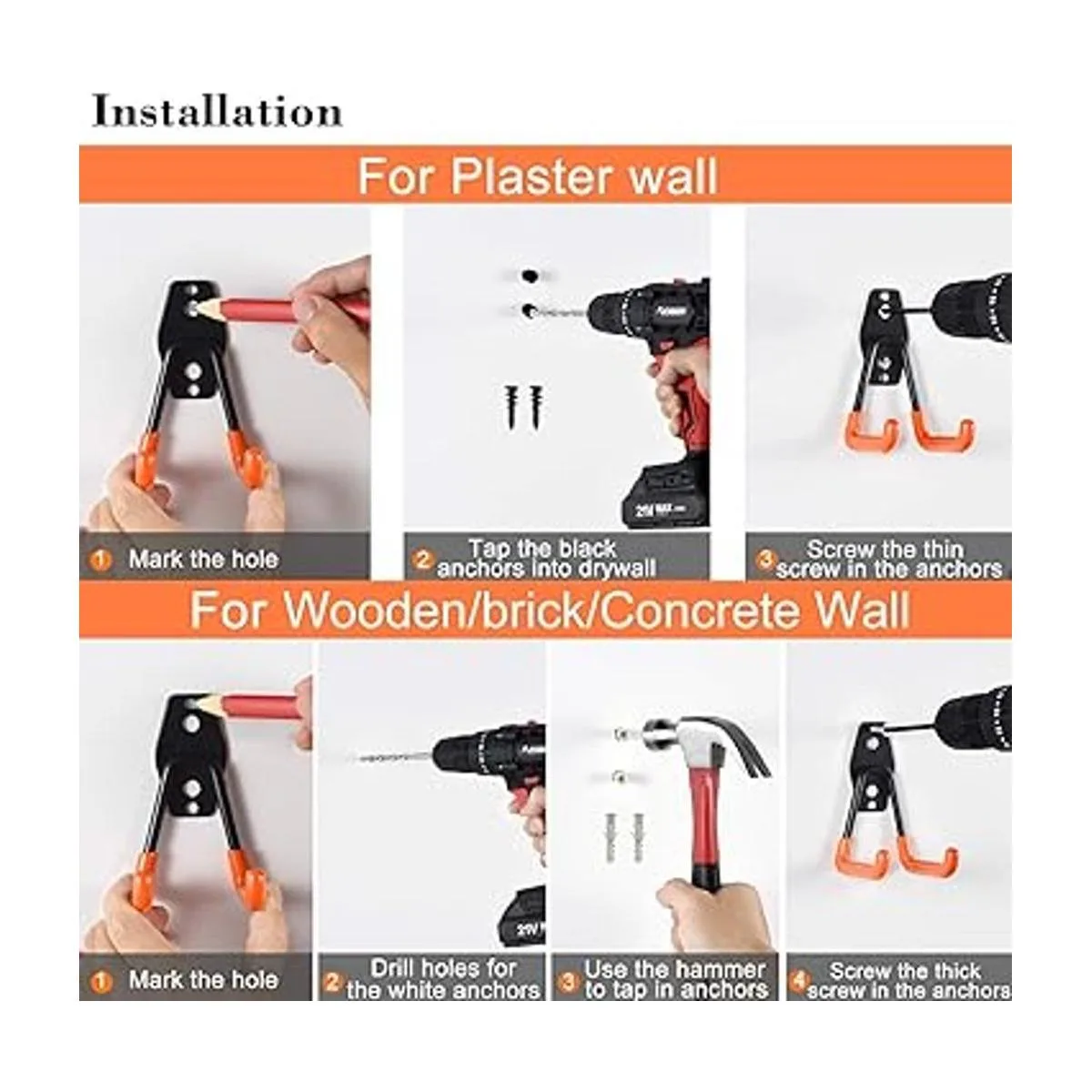 Fácil instalación: los ganchos para herramientas de garaje solo necesitan un taladro y destornillador, puedes instalarlos fácilmente en cualquier pared, proporcionamos tornillos y tacos de pared en el paquete, consulta nuestras instrucciones idioma español no garantizado.