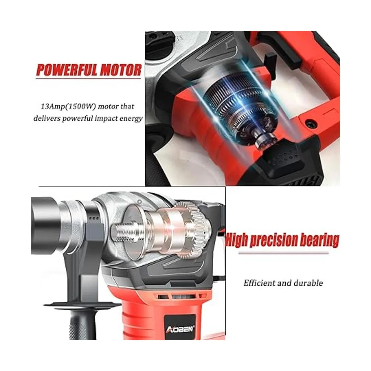 AOBEN SDSPlus Rotomartillo de 114 pulgadas SDSPlus, control de vibración y embrague de seguridad, 13 amperios para hormigón, incluye 3 brocas planas, cinceles puntuales, portabrocas