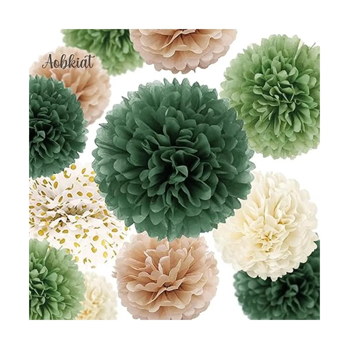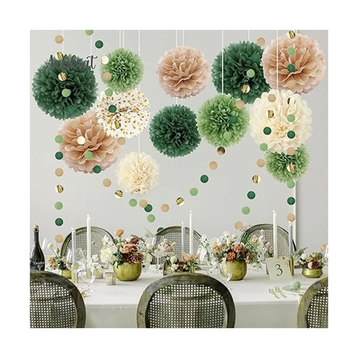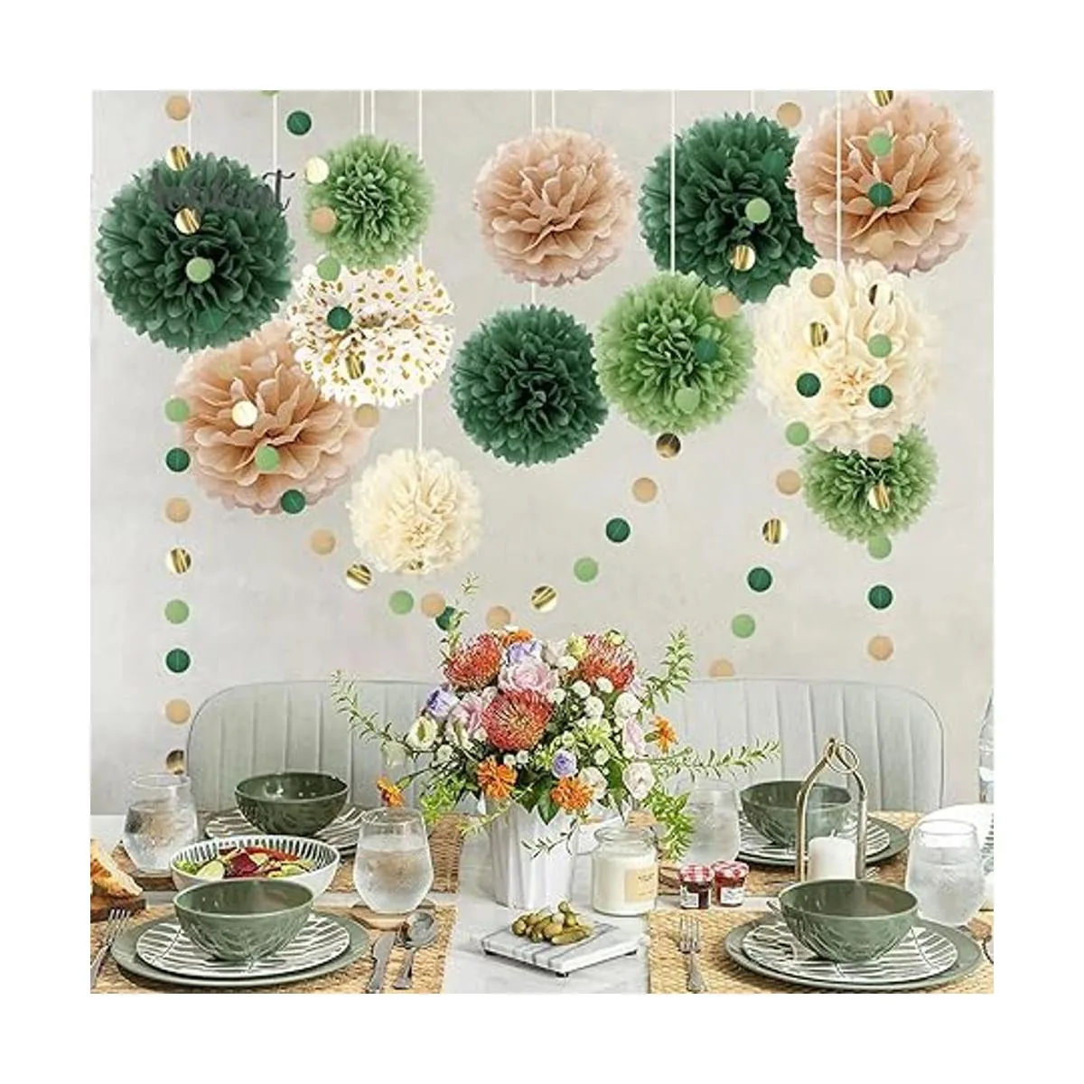 AOBKIAT Juego de decoración para fiesta de boda, 15 pompones de papel de seda verde, guirnalda de papel de puntos, telón de fondo colgante para compromiso, boda bohemia verde, baby shower