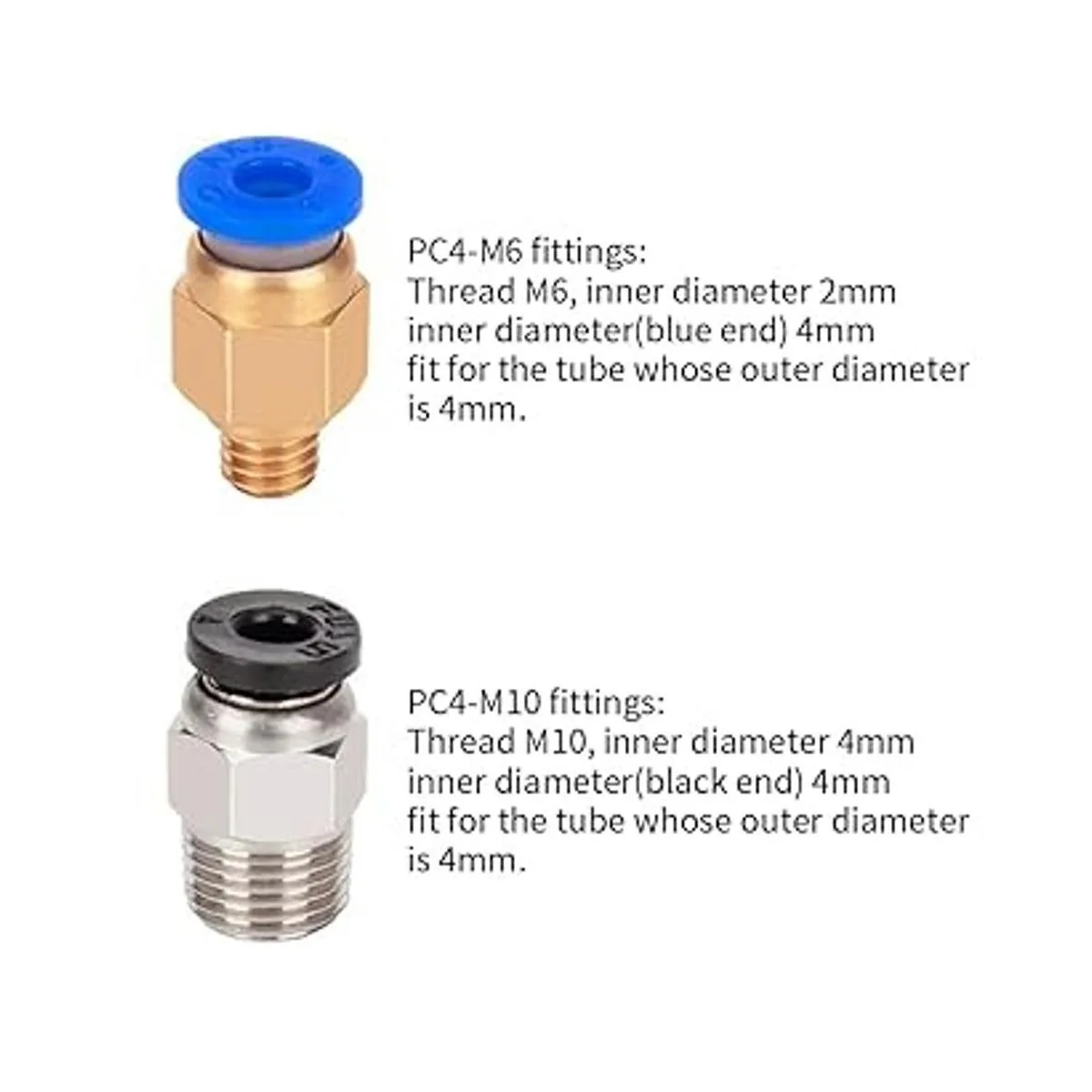 Fácil de instalar: los accesorios de la extrusora son PC4M6 y los accesorios del hotend son PC4M10, la parte superior se puede insertar un tubo de PTFE de 0.157 in de diámetro exterior y autobloqueante.