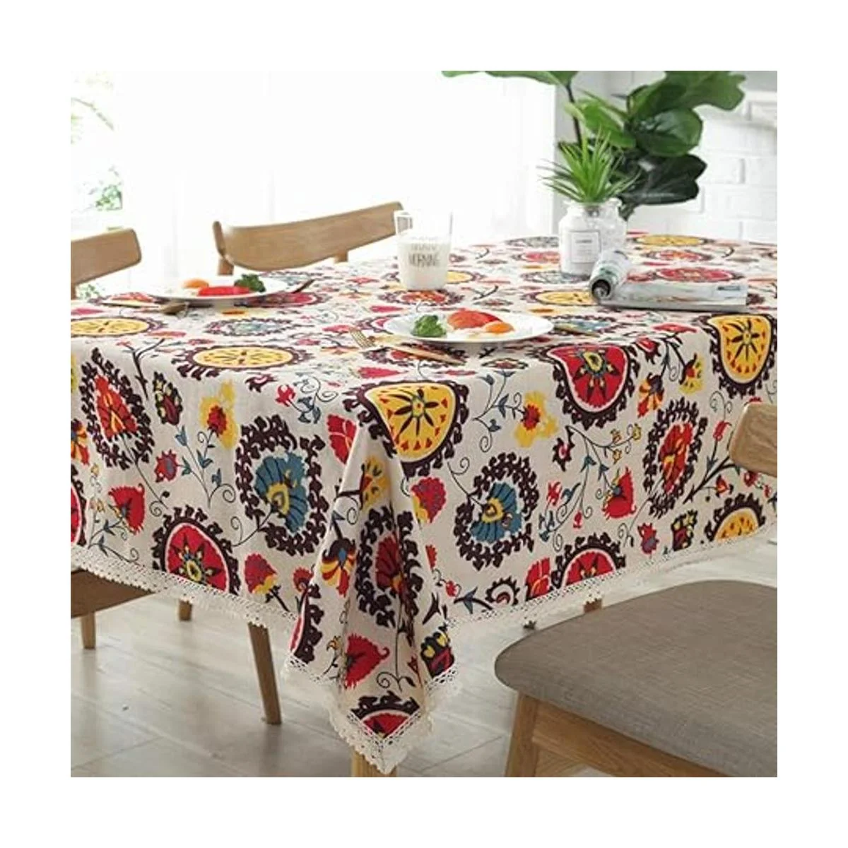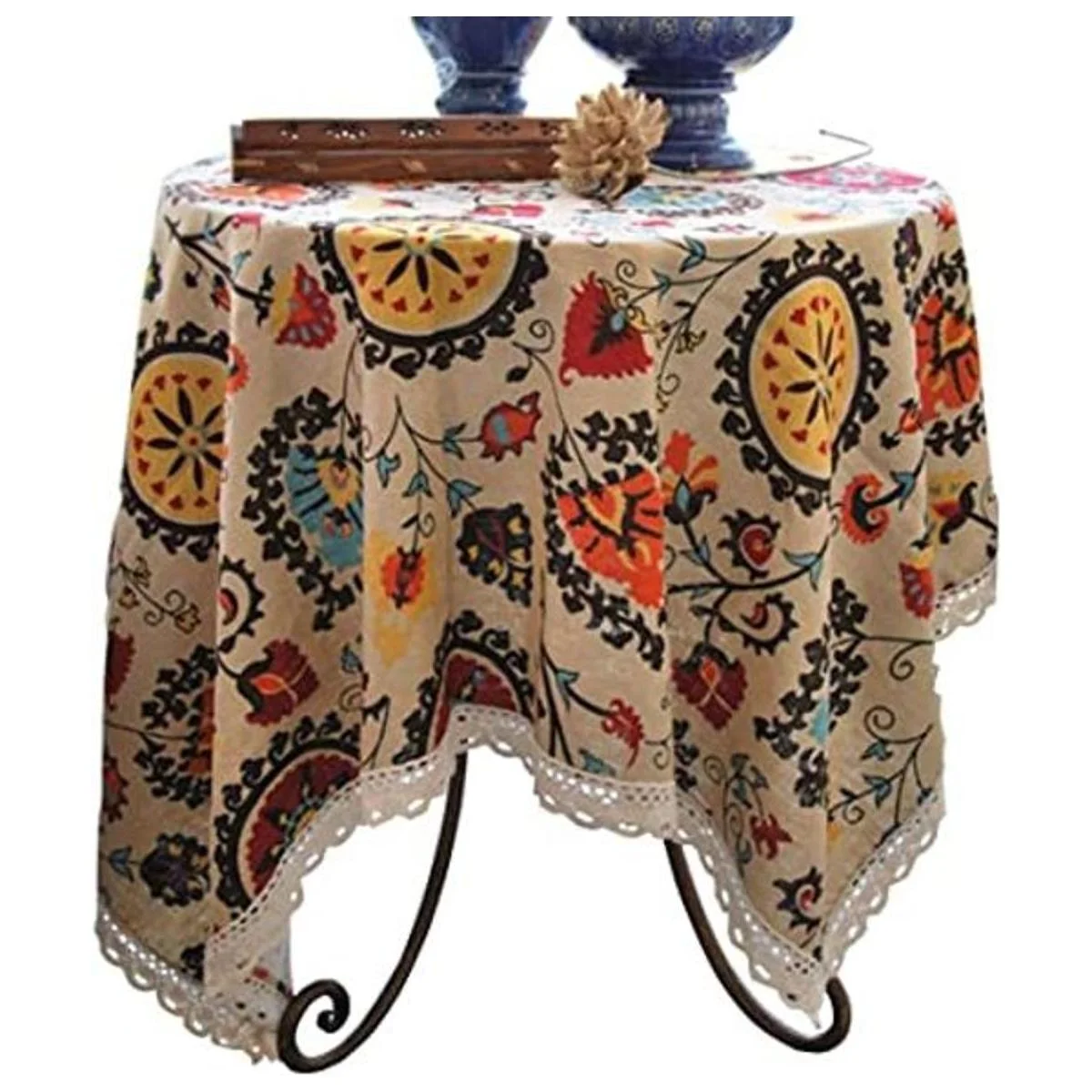 Diseño bohemio: elegante patrón floral con borde de encaje, color vibrante. El mantel de estilo bohemio es adecuado para patio, jardines, cocina, comedor, fiesta en el patio.