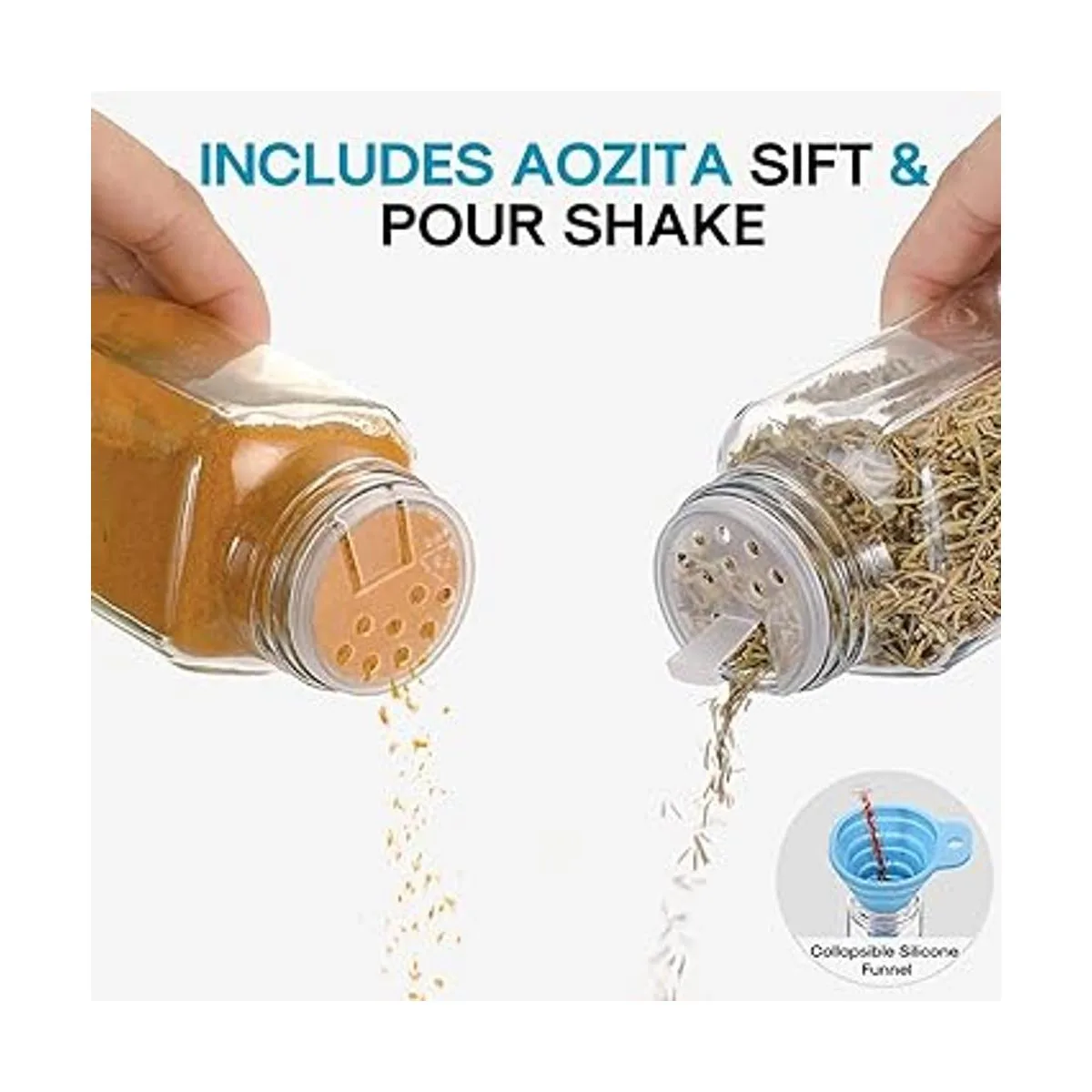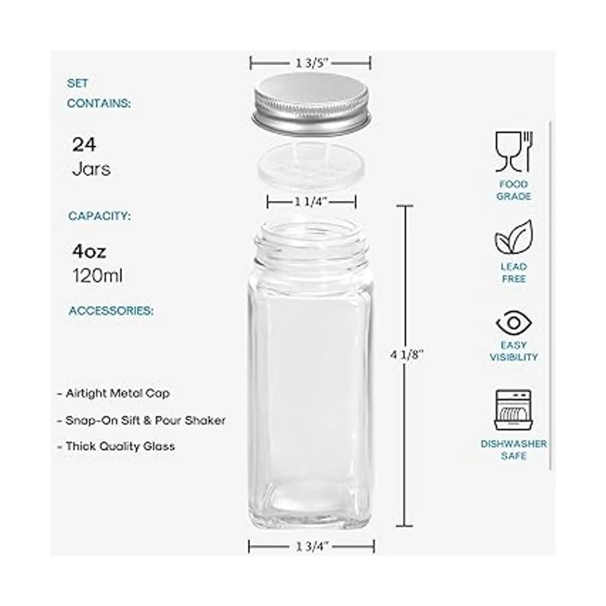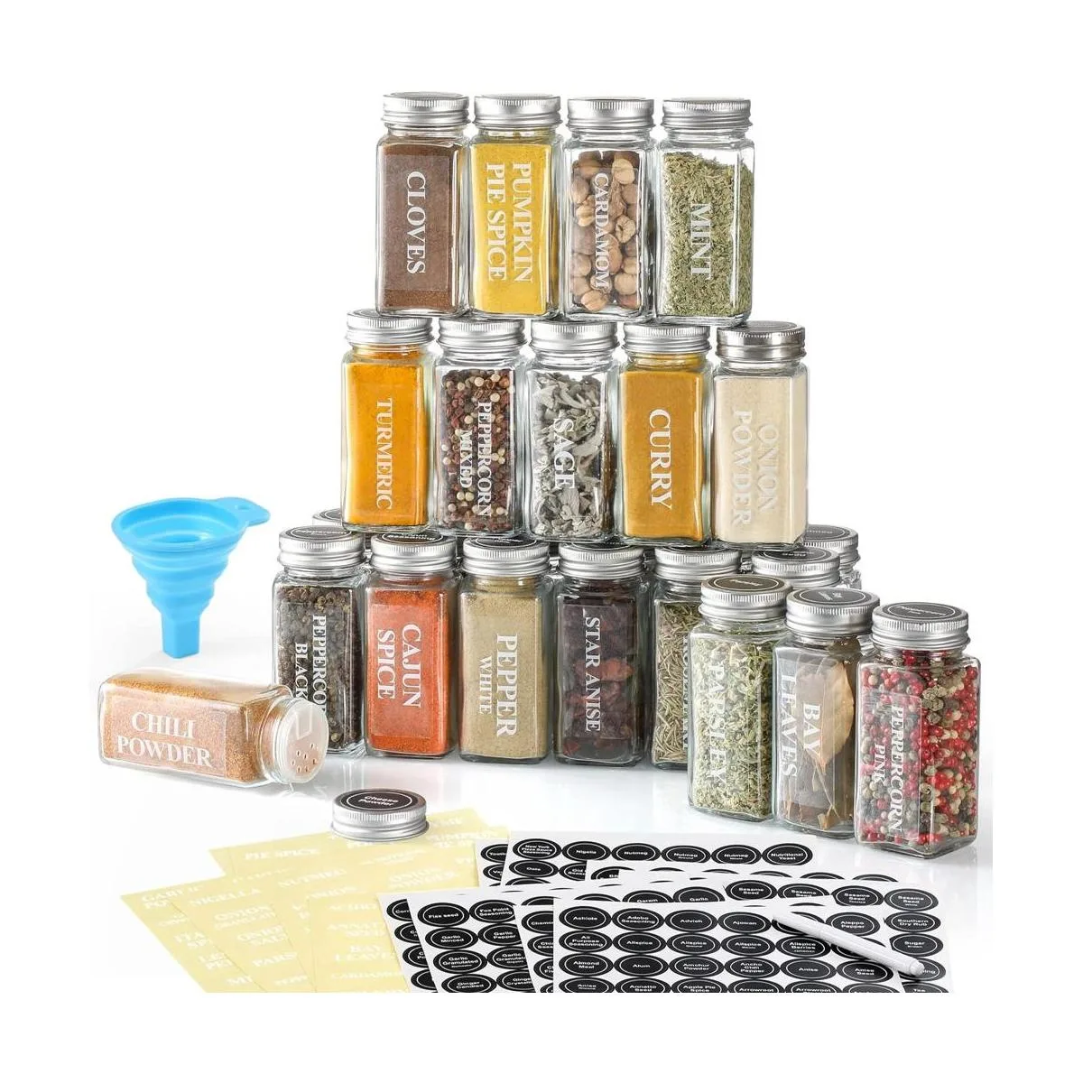 AOZITA 24 tarros de especias de vidrio con etiquetas de especias, recipientes cuadrados vacíos de especias de 4 onzas, olla de condimentos, tapas para coctelera y tapas de metal herméticas, embudo plegable de silicona incluido