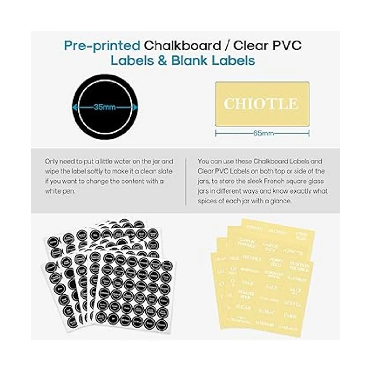 Juego completo de botellas cuadradas para especias: 24 tarros cuadrados de vidrio vacíos, 24 tapas de coctelera, 24 tapas de metal y 2 tipos de etiquetas impermeables para tarros de especias etiquetas de PVC transparente preimpresas, etiquetas de pizarra y etiquetas en blanco, un embudo de silicona plegable para ayudar a transferir especias, simplificando la tarea de recarga