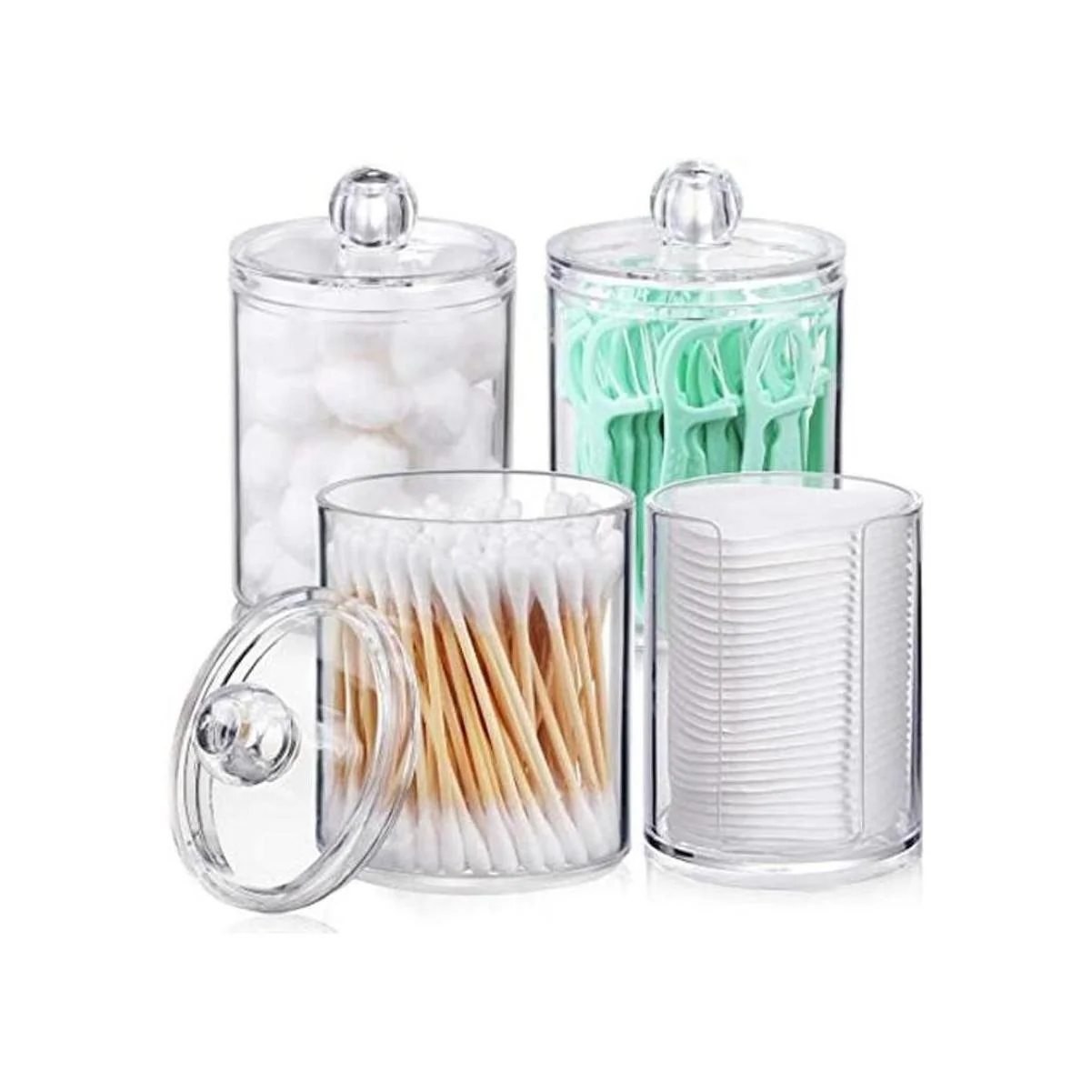 AOZITA 4 unidades, dispensador de soporte Qtip de 10 onzas para bola de algodón, hisopo de algodón, almohadillas redondas de algodón, hilo dental, juego de tarros de plástico transparente para organización de almacenamiento de recipientes de baño, organizador de maquillaje de tocador