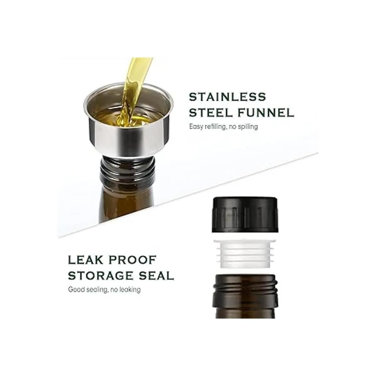 Embudo y tapas de sellado: el embudo de acero inoxidable es para ayudar a rellenar fácilmente y evitar derrames mientras se vierte de un hervidor de aceite más grande. Las tapas de sellado y los tapones de enchufe proporcionan doble a prueba de fugas y sellado cuando estás temporalmente fuera de uso o quieres almacenar aceite en la botella.