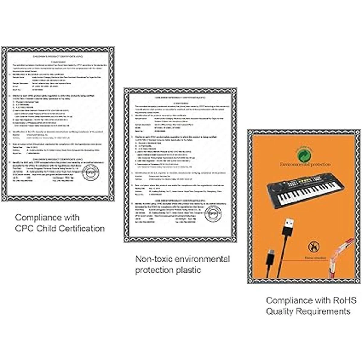 KIDS PIANO KEYBOARD PARAMETER Age:38 years old. Product size: 16.9 6.2 2.1inchL W H, Material: ABS, Nontoxic environmental protection plastic. The kids piano has been certified by CPC children and conforms to RoHS safety certification.