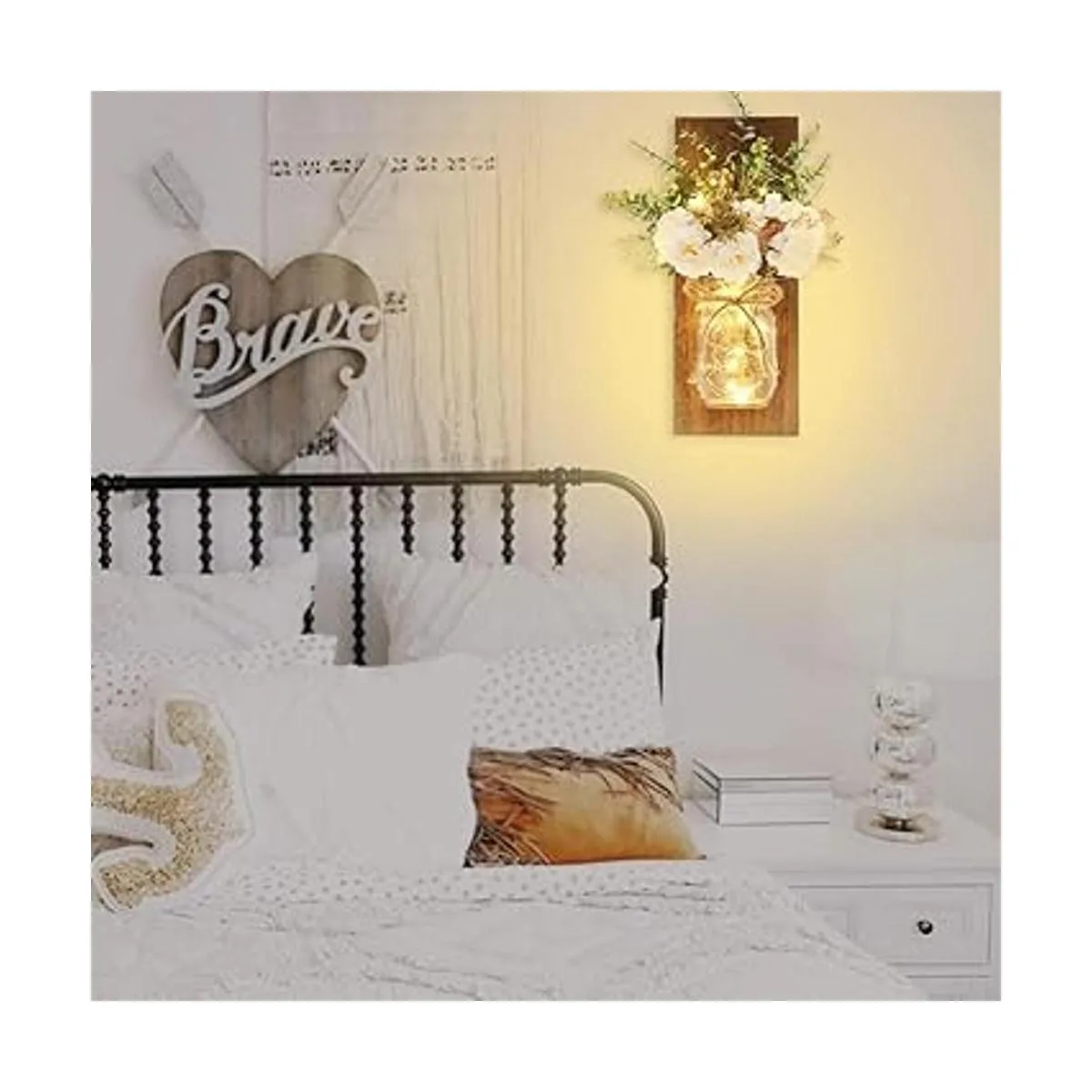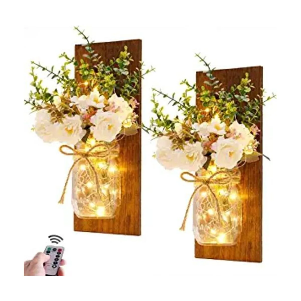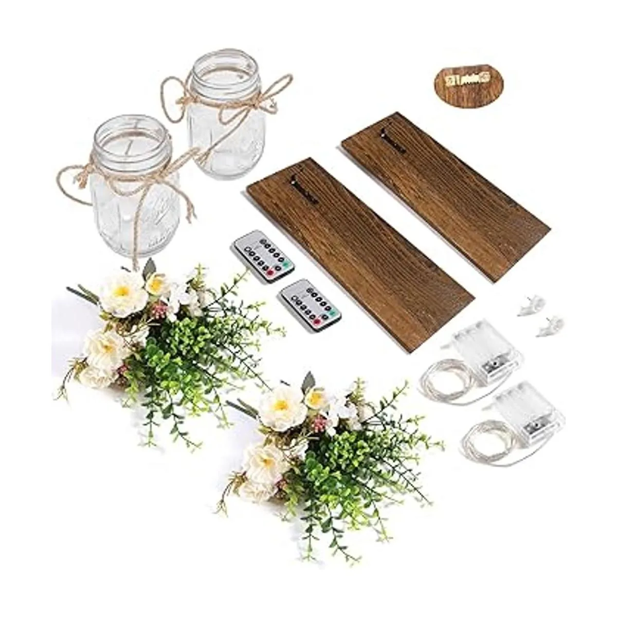 Apliques de pared rústicos con diseño de tarro de masón, hechos a mano, diseño colgante con control remoto, luces LED de hadas y peonía blanca, decoración de cocina de granja, decoración del hogar, decoración de sala de estar, juego de dos luces