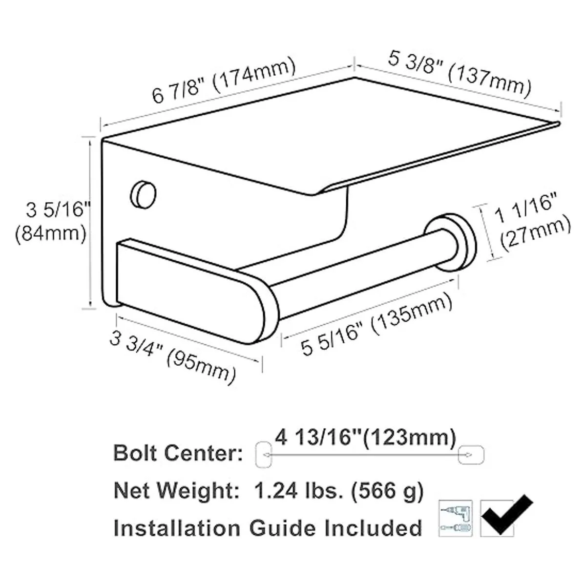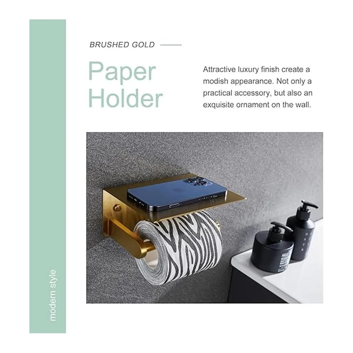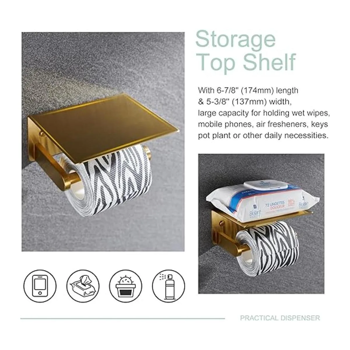 Doble propósito, satisface diferentes necesidades, soporte de papel higiénico con estante de almacenamiento resistente, mantiene el papel higiénico mientras añade un lugar seguro para almacenar varios artículos, por ejemplo, teléfono celular, altavoz Bluetooth u otros dispositivos electrónicos pequeños. También para toallitas húmedas o recipientes, pañuelos faciales, ambientadores, etc