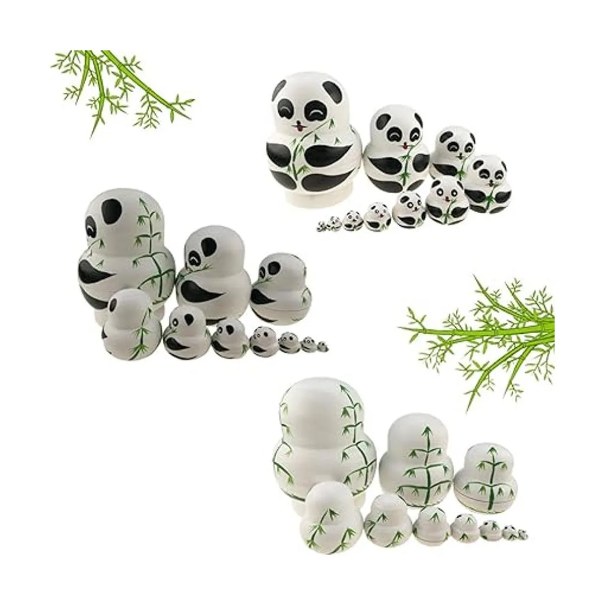 Apol Juego de 10 osos de panda hechos a mano de madera de vientre grande con muñecas de anidación de bambú, muñeca rusa Matryoshka en una caja con lazo para niños, juguete para decoración del hogar, Año Nuevo