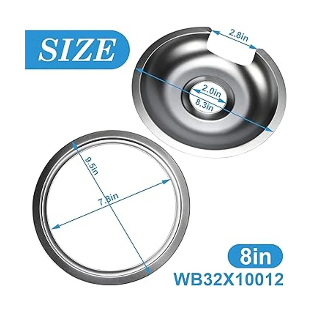 APPLIANCEMATES Juego de 4 bandejas de goteo cromadas de 6 pulgadas, WB32X10012, 1 bandeja de goteo grande de 8 pulgadas WB32X10012, paquete de 4 unidades para GE Electric Range de repuesto 3 bandeja de 6 pulgadas anillo y 1 bandeja anillo de 8 pulgadas