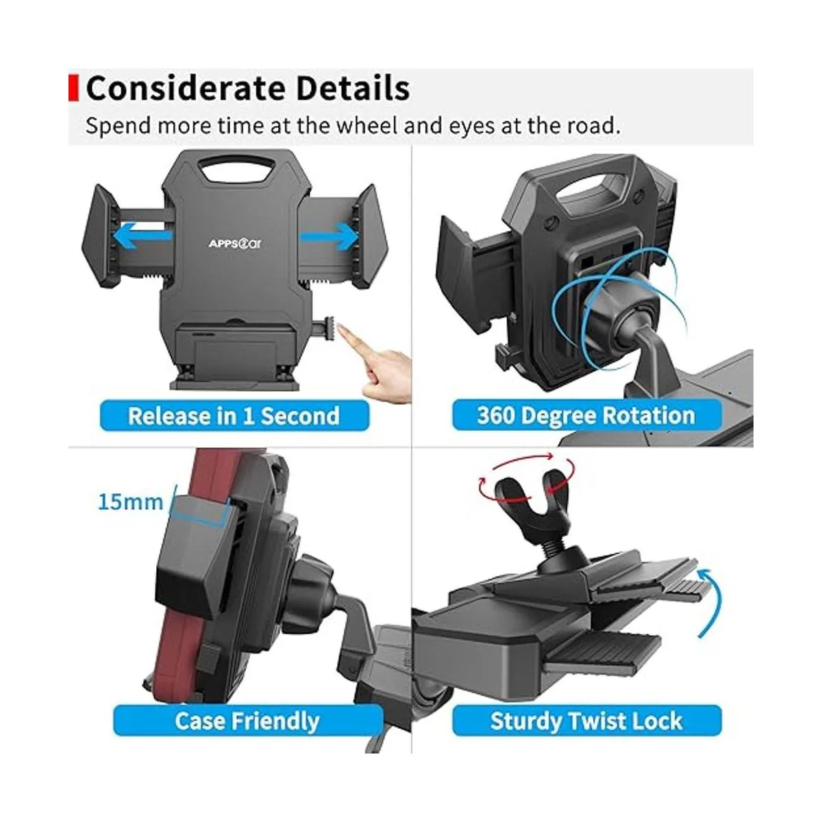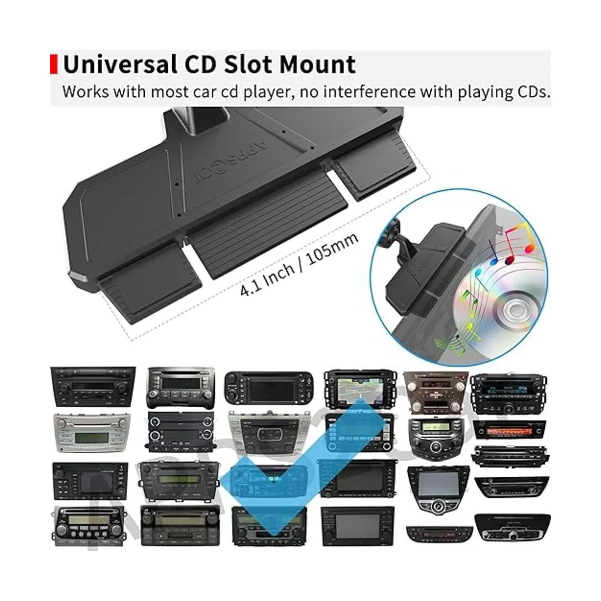 Protección avanzada y soporte resistente: con 3 agarres laterales: parte inferior plegable y dos brazos ajustables con almohadilla de silicona. Sujeta el teléfono celular firmemente. Diseño de base atornillada. Mucho más seguro que el soporte de ventilación de aire o el soporte de ventosa para parabrisas. Sin interferencia con la reproducción de CD.