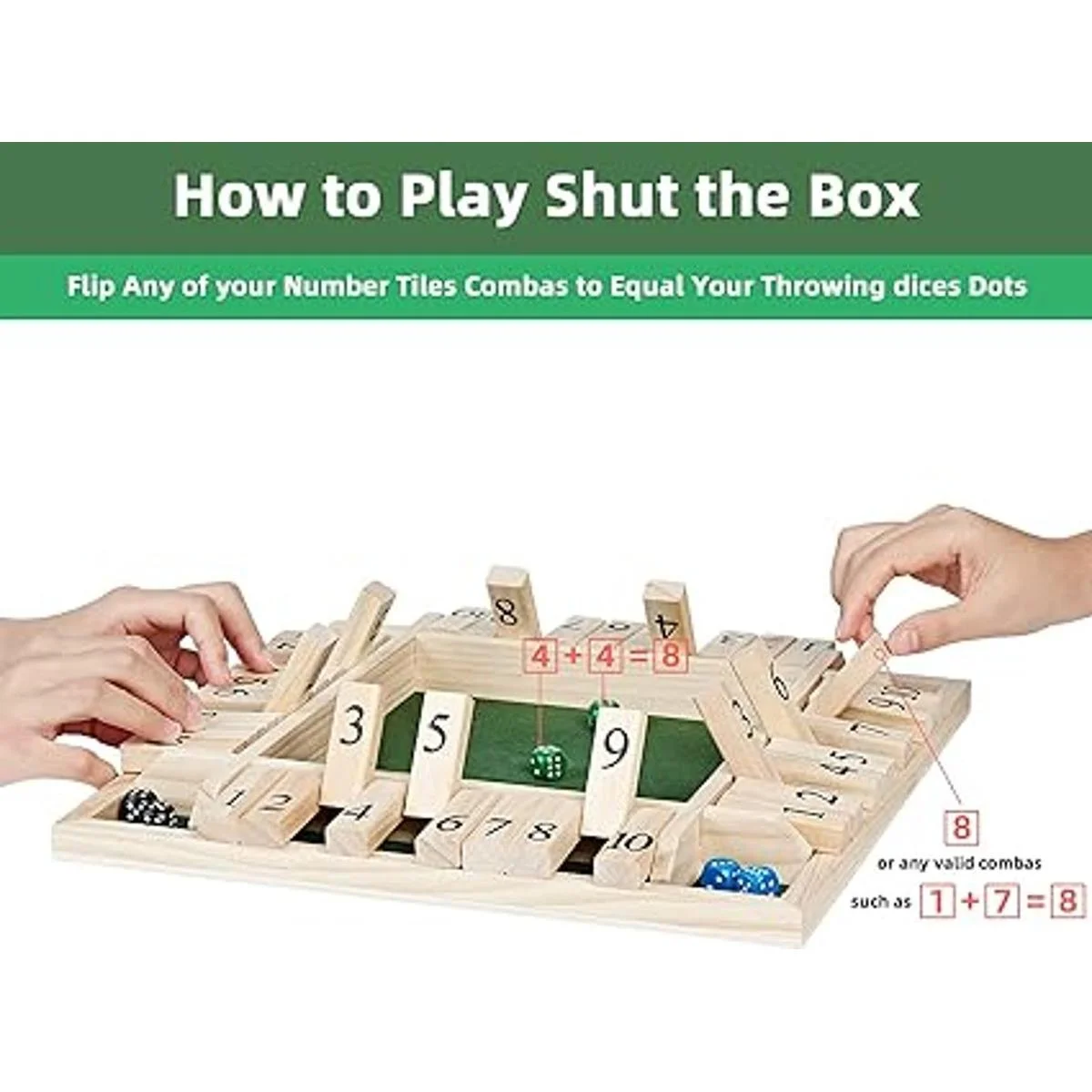 Cierra la caja de 4 jugadores con dados de colores: nuestro juego de Shut the Box incluye todo lo que necesitas para comenzar un fascinante y emocionante juego de mesa para 24 jugadores. Este juego de mesa de 4 vías mide 14 x 14 x 2 pulgadas. Cuenta con 10 azulejos de números de madera de serigrafía a cada lado para traer más combinaciones numéricas. Viene con 4 juegos de dados de colores que permiten que cada jugador obtenga sus propios dados rojo, verde, azul, negro. Es divertido para niños pequeños de hasta 6 años.