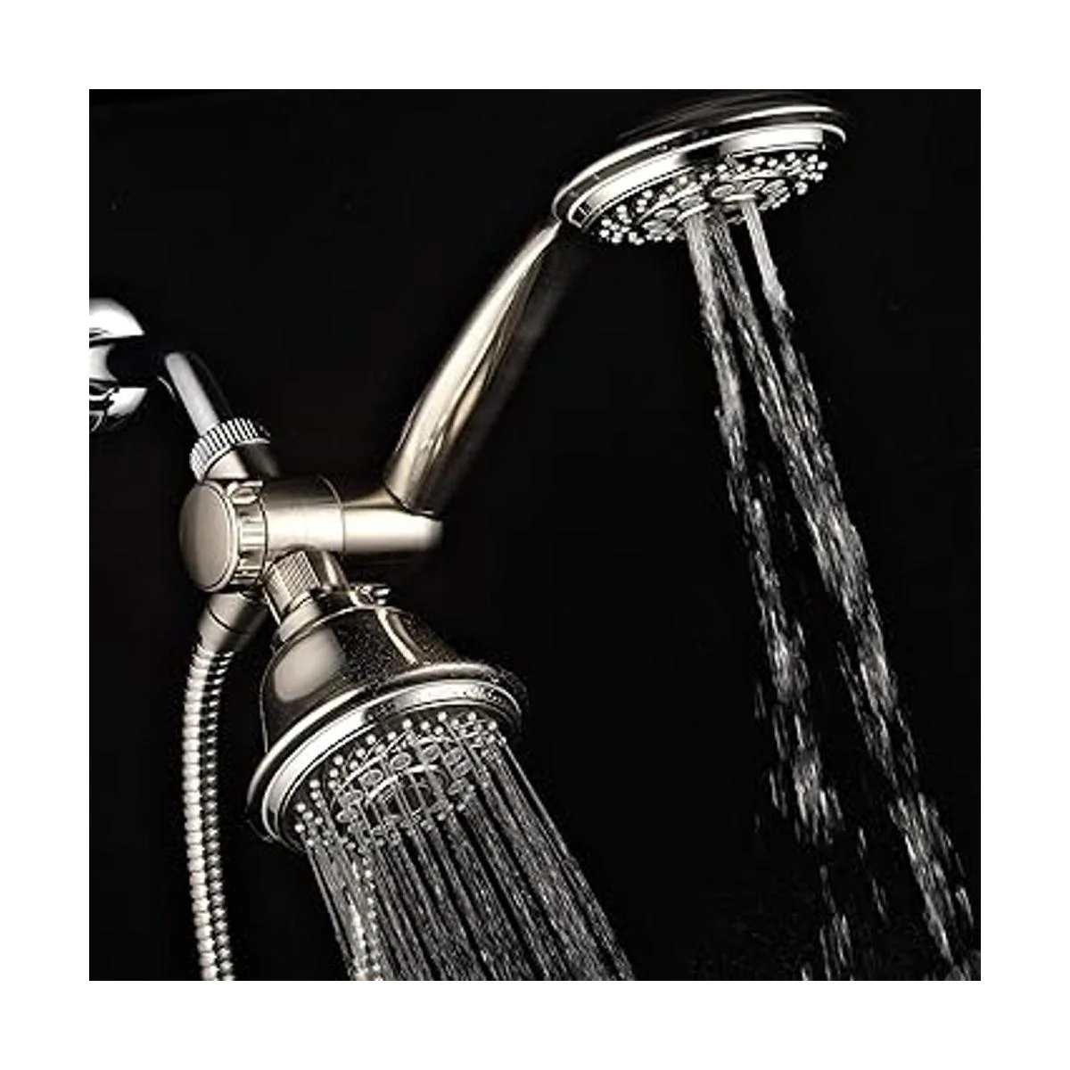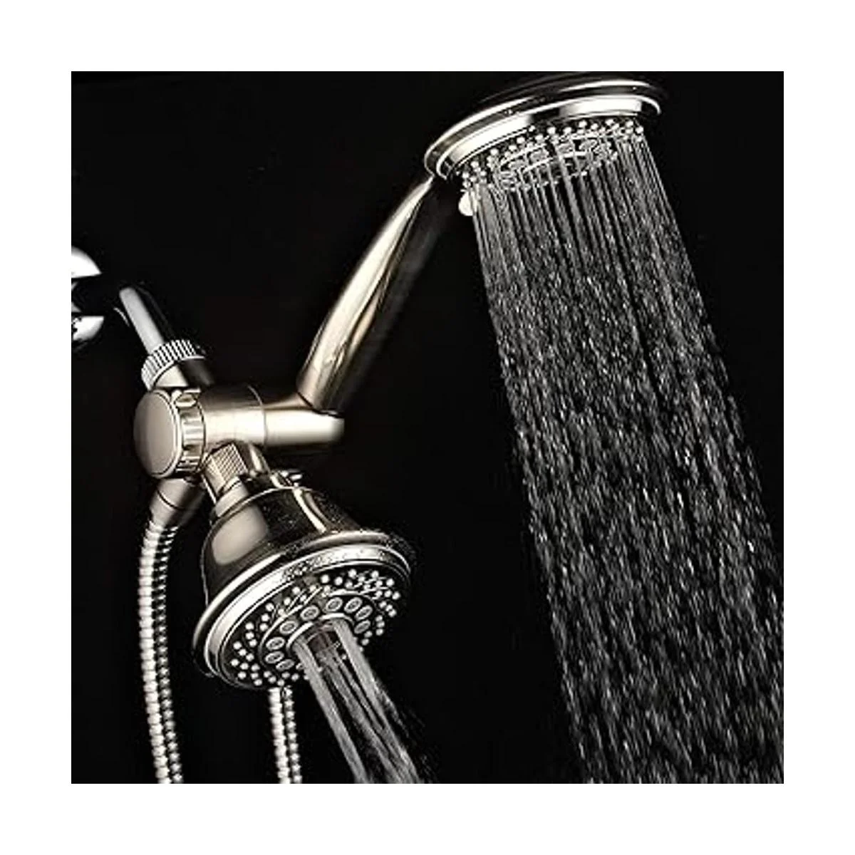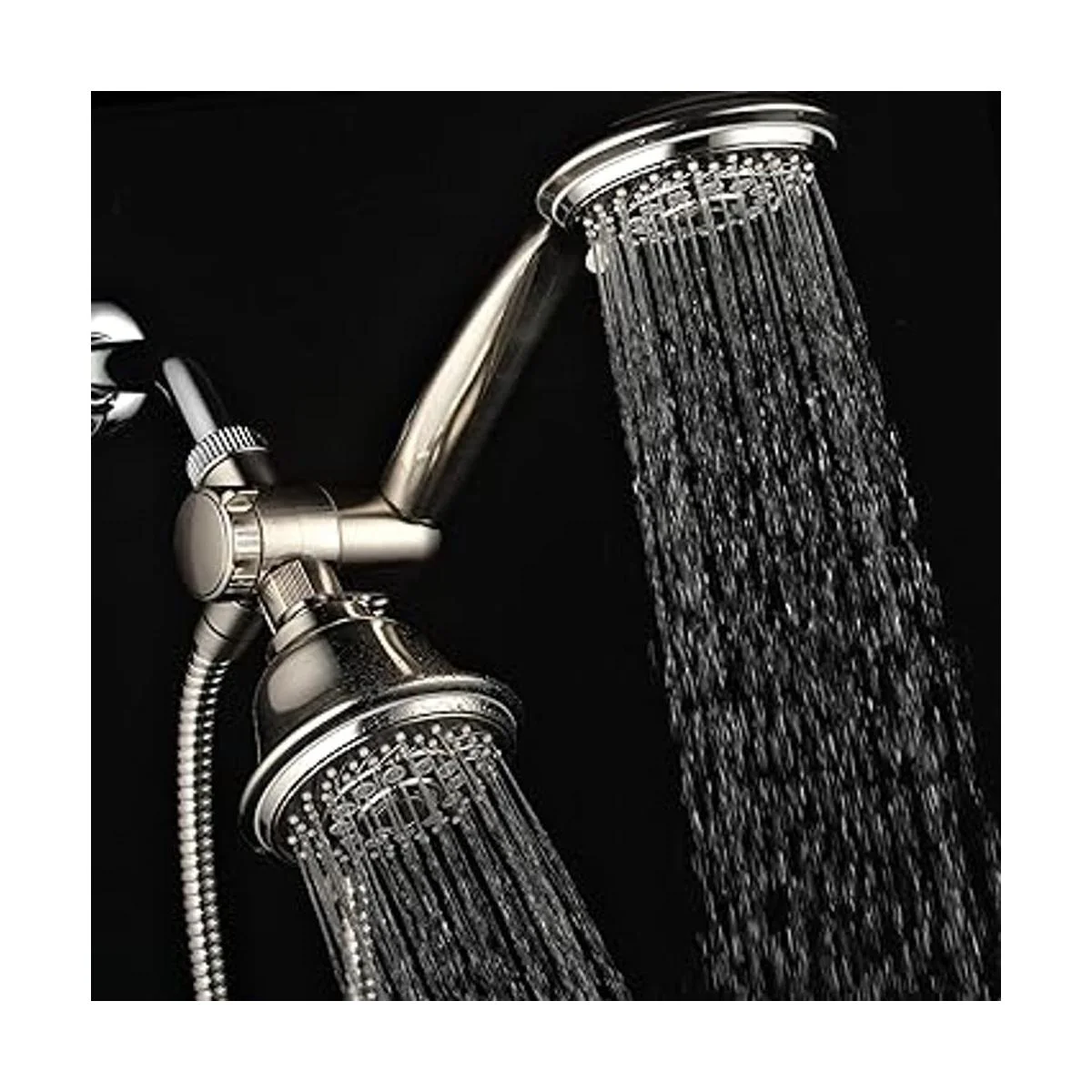 Ducha de spa de alta presión. Utiliza cada lujosa ducha de 6 ajustes por separado o ambos juntos. Elige lluvia potente, masaje pulsante, niebla hidratante, lluvia económica de ahorro de agua y múltiples ajustes mezclados individuales y duales. Características avanzadas incluyen dial de 3 zonas de acción de clic en espiral con chorros antiobstrucción, desviador de agua patentado de 3 vías con tuerca de bloqueo antigiro, soporte superior de doble ángulo ajustable y manguera de acero inoxidable reforzada extra flexible de alta calidad.