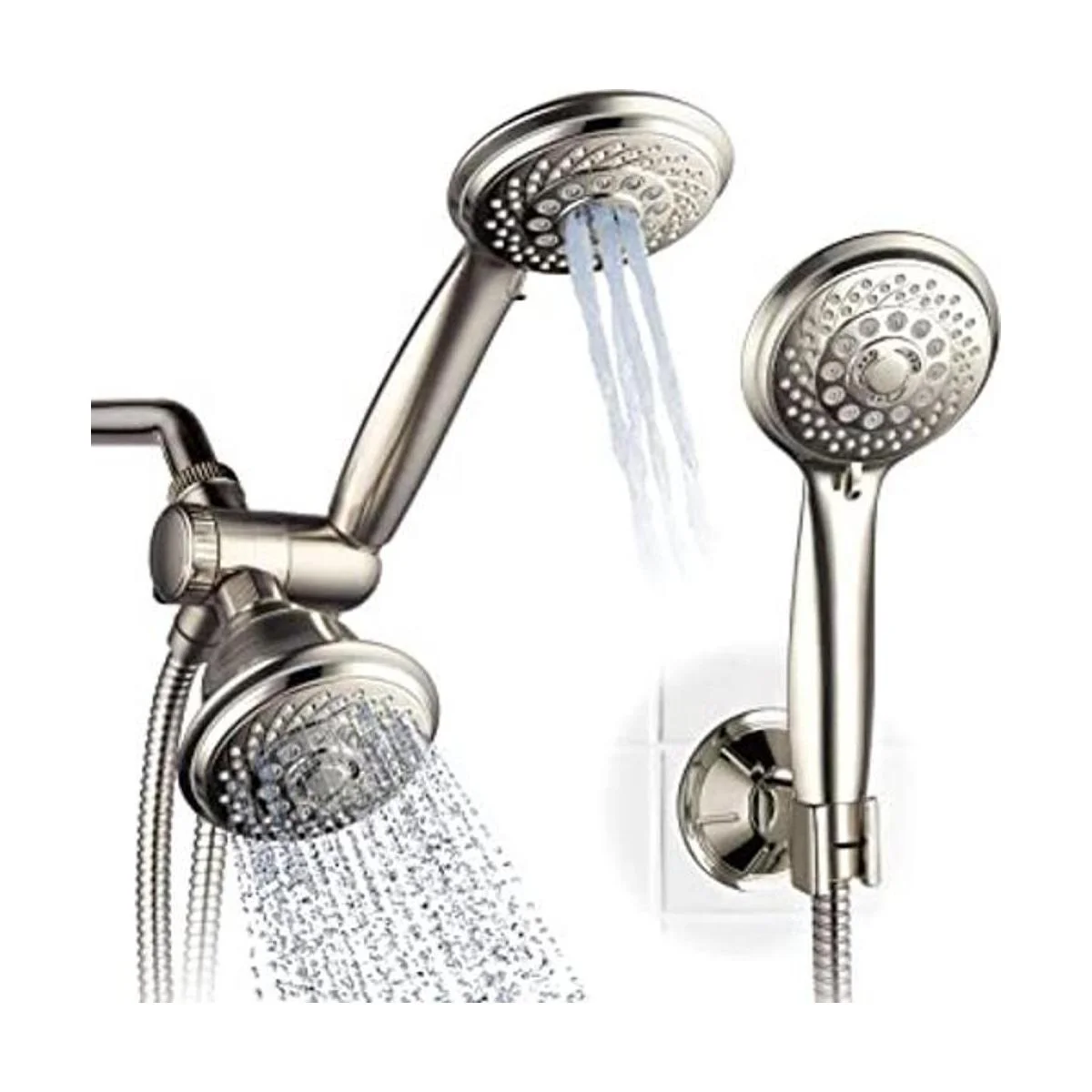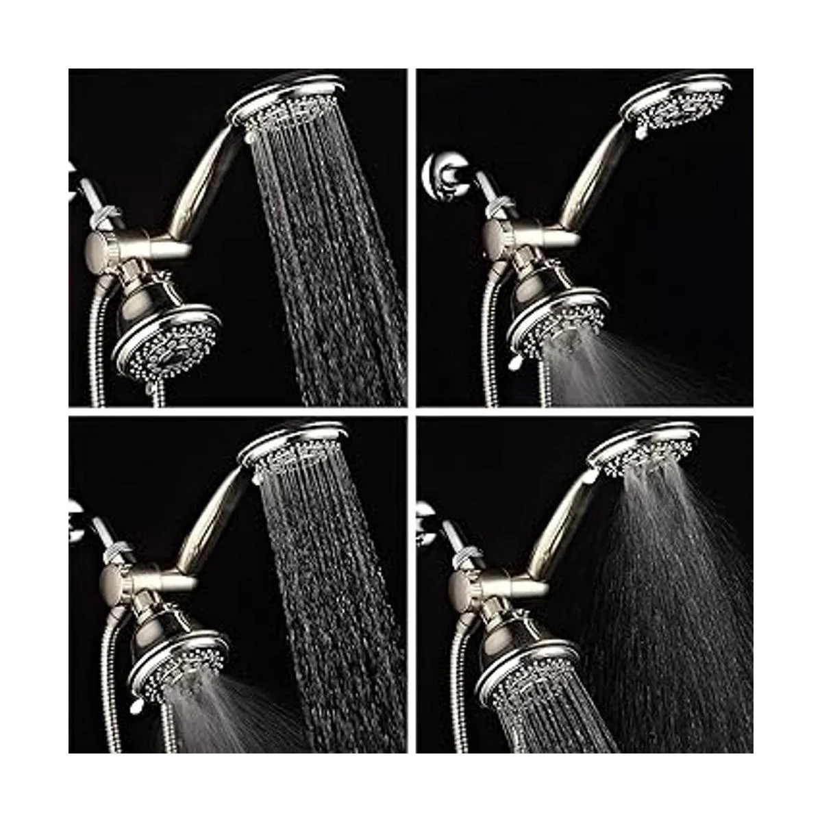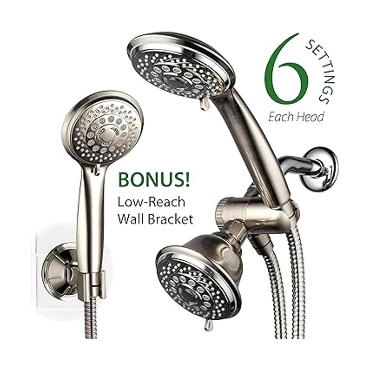 Ducha de spa de alta presión. Utiliza cada lujosa ducha de 6 ajustes por separado o ambos juntos. Elige lluvia potente, masaje pulsante, niebla hidratante, lluvia económica de ahorro de agua y múltiples ajustes mezclados individuales y duales. Características avanzadas incluyen dial de 3 zonas de acción de clic en espiral con chorros antiobstrucción, desviador de agua patentado de 3 vías con tuerca de bloqueo antigiro, soporte superior de doble ángulo ajustable y manguera de acero inoxidable reforzada extra flexible de alta calidad.