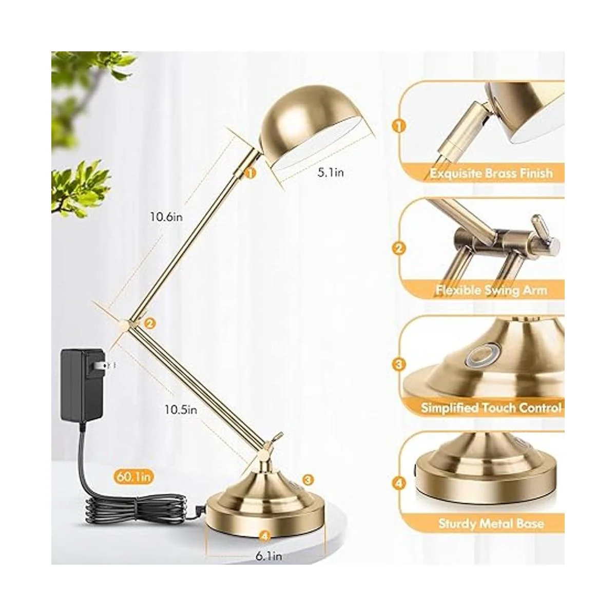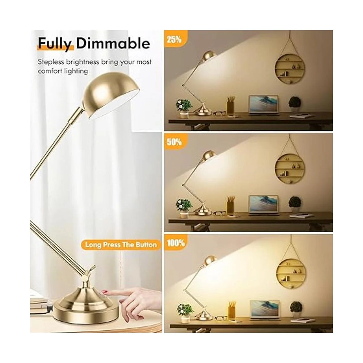 Excelente diseño ajustable y exquisito acabado dorado Esta lámpara de escritorio flexible combina con cabezal móvil de 90 y brazo oscilante de 360, lo que permite que la luz cubra toda tu lectura, juego, zona de trabajo sin zumbidos ni parpadeos. El diseño de arquitecto plegable hace el máximo uso en tu espacio. Además, el acabado de latón dorado de alta calidad te ofrece una luz de lectura duradera y fácil de mantener. No te preocupes por oxidarse o corroerse. Haz tu lámpara de escritorio vintage e ilumina todo tu entorno.