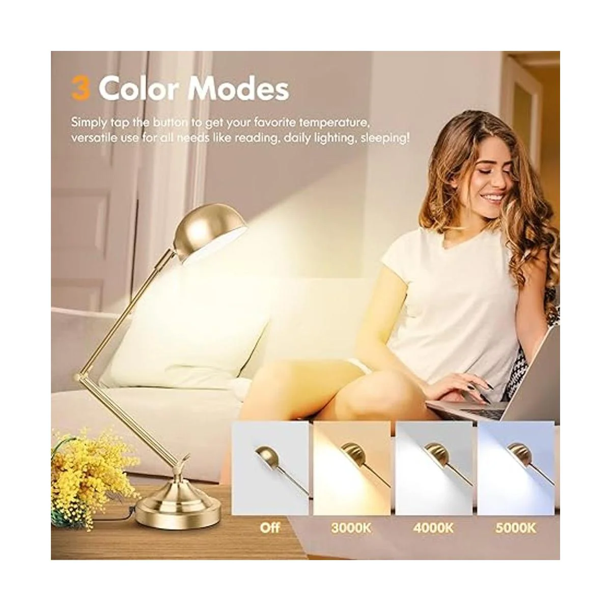 Control táctil y 3 modos de color La lámpara de escritorio LED TOBUSA adopta un control táctil sensible de un botón, satisface todas tus necesidades de iluminación Simplemente toca el dedo para encender/apagar la luz y cambiar el modo de color como quieras. Sin complicaciones para encontrar el interruptor giratorio en total oscuridad Blanco cálido de 3000 K, ideal para relajarse. Blanco natural de 4000 K, bueno para leer. Luz blanca diurna de 5000 K, ideal para el trabajo de oficina. La iluminación sin parpadeo hace que sea una lámpara de escritorio amigable y un regalo considerado para tus familiares y amigos.
