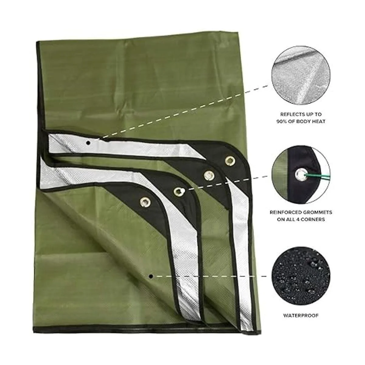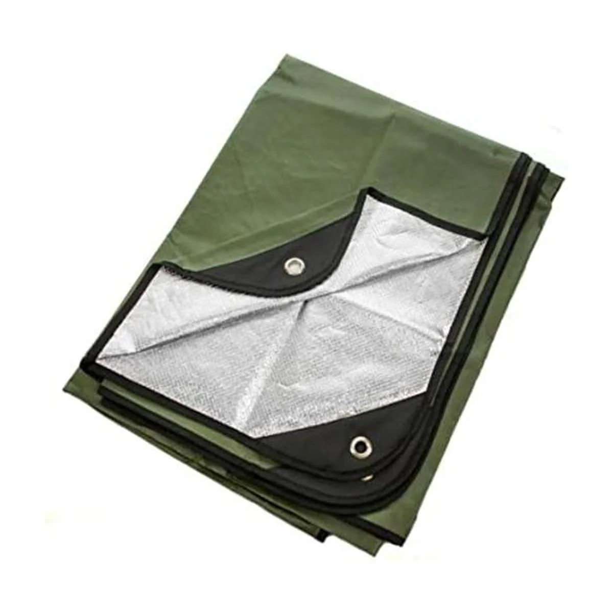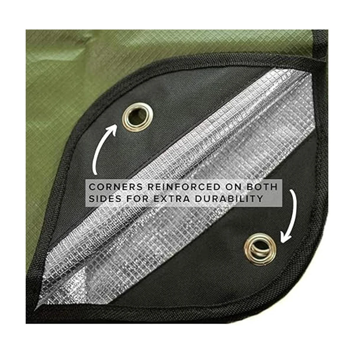 Manta para todo tipo de clima: esta manta única cuenta con un lado reflectante de Mylar que se puede utilizar para reflejar el calor, crear una barrera radiante o señal de ayuda. El otro lado está hecho de dos capas de polipropileno, lo que crea una barrera impermeable y se puede utilizar como manta, lona o refugio.