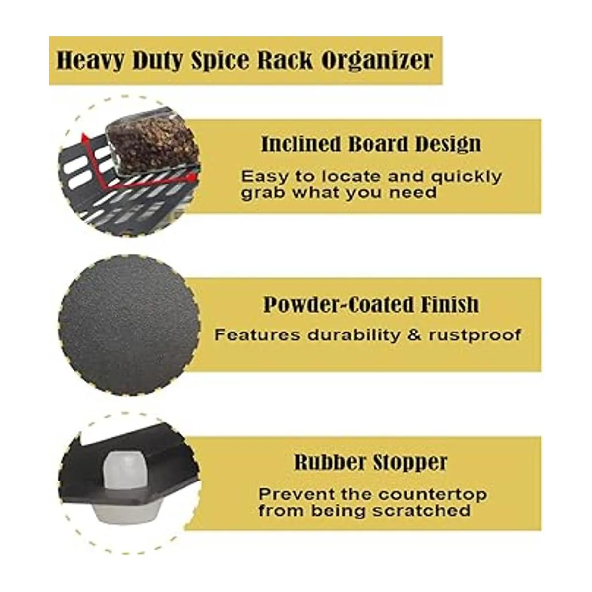 Estructura de metal duradera: el estante de especias está hecho de una construcción de chapa resistente y gruesa con un acabado recubierto de polvo negro que es resistente al óxido. Las patas antideslizantes de este soporte de especias para armarios interiores evitan que el organizador de armario de especias se mueva o se deslice, se mantiene uniformemente.