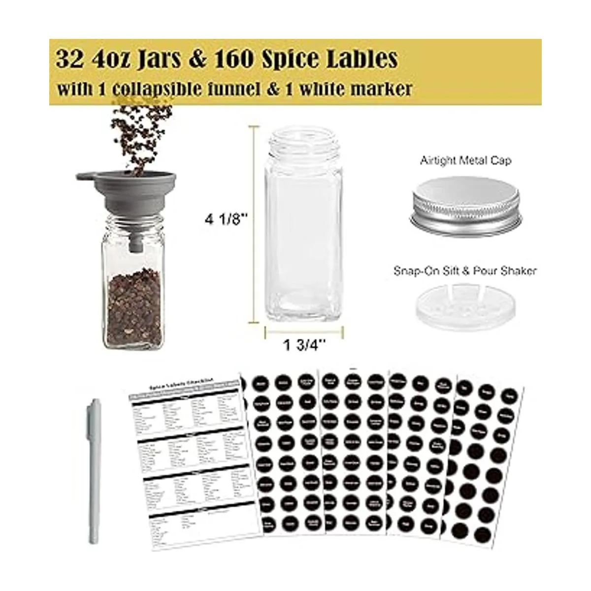 Viene con 32 tarros de especias de 4 onzas y 160 etiquetas. Total 1 estante de especias de 4 niveles, 32 tarros cuadrados de vidrio vacíos, 160 etiquetas de especias, 1 embudo de silicona plegable, 1 marcador blanco que componen un juego completo de especias y condimentos. Los tarros de especias están hechos de vidrio duradero de alta calidad, las tapas de tamiz y vertido te permiten agitar o medir con cucharas moderadas para tu cocina. Las 135 etiquetas preimpresas contienen la mayoría de nombres de especias, o puedes hacer tus etiquetas con 25 etiquetas en blanco y marcador de tiza.