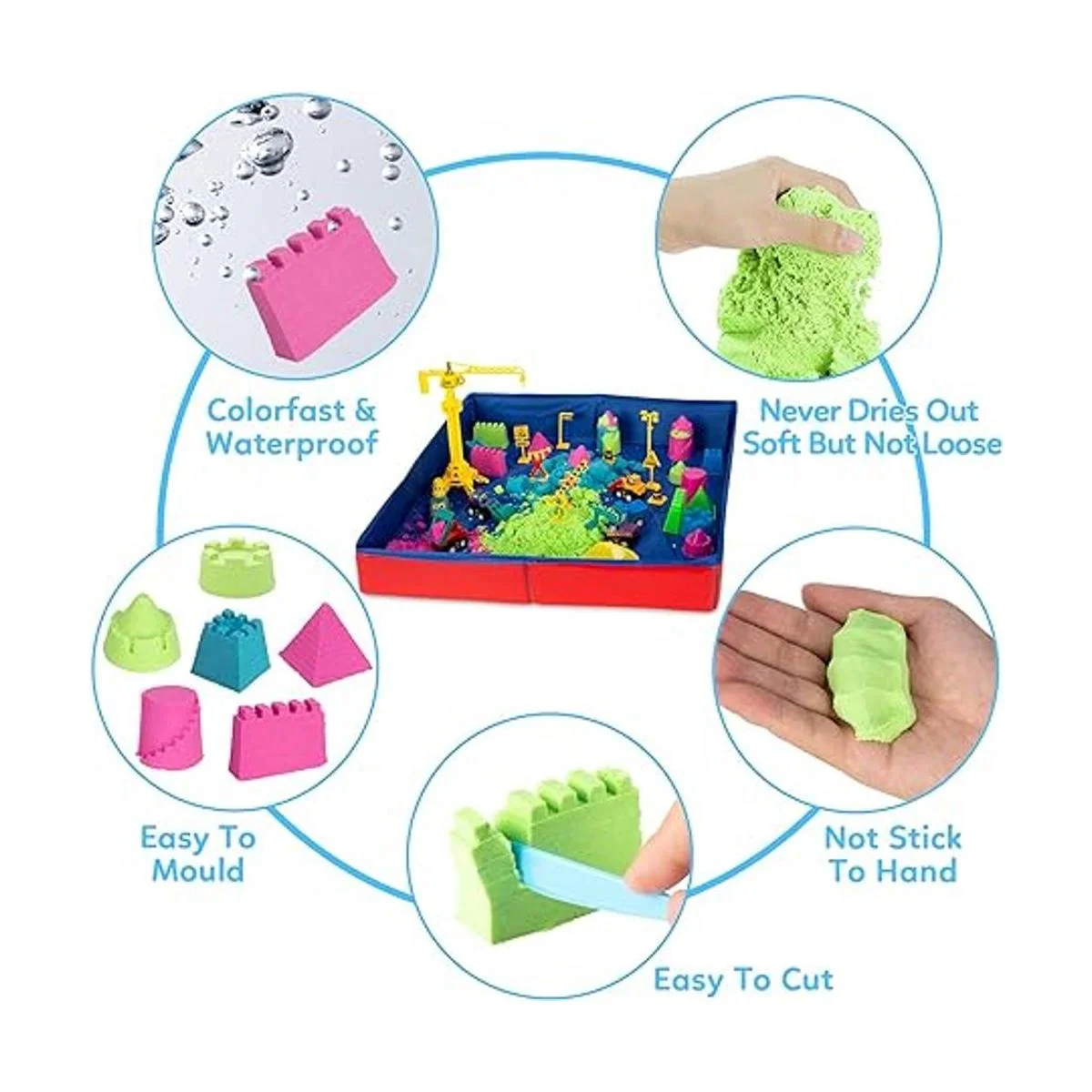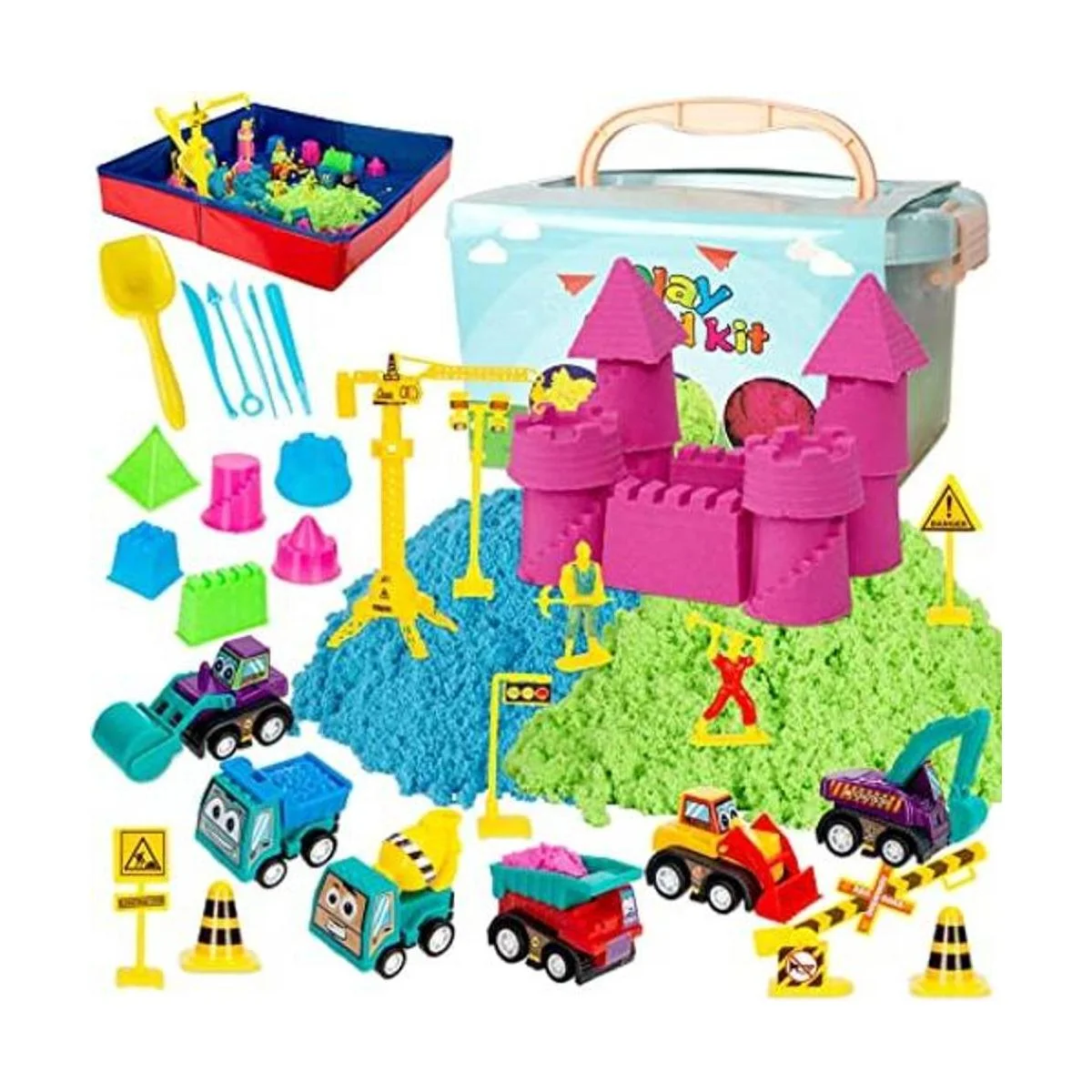 Caja de arena de construcción: la caja incluye 3 colores de arena 1 libra por color, 10 juguetes de construcción, 6 camiones de construcción de tracción, 6 modelos de castillo, 5 herramientas de arena, 1 pala, 1 caja de arena plegable. Hay todo lo que los niños necesitan para divertirse en la playa.