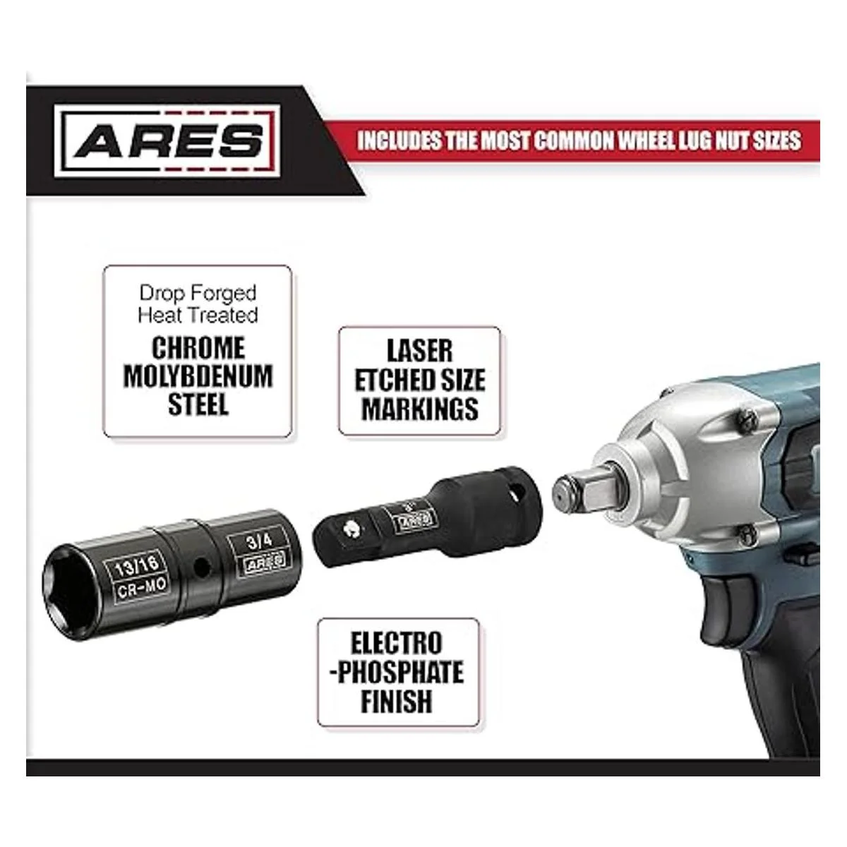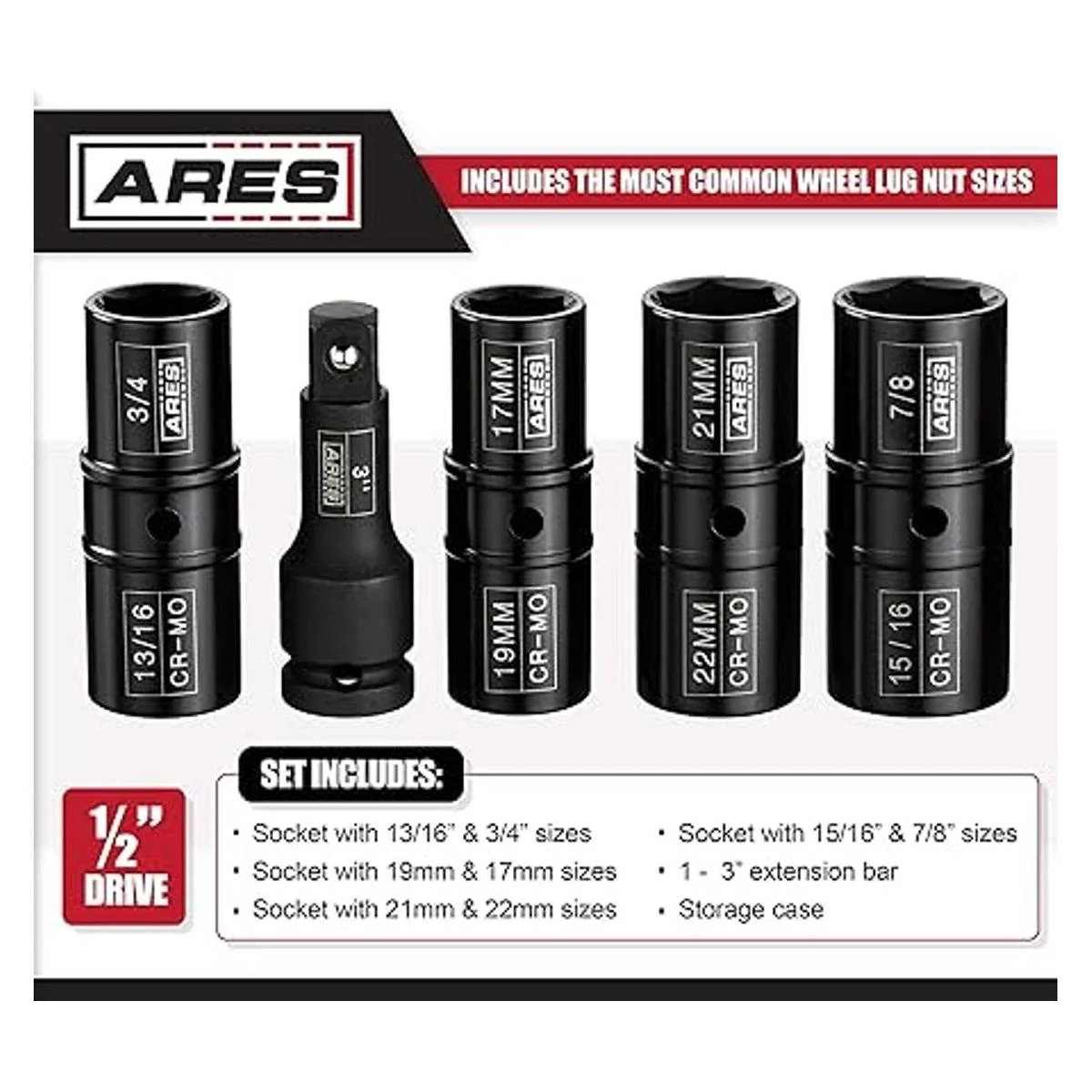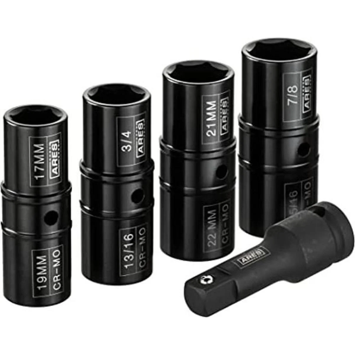 ARES 59010 Juego de 5 piezas de 12 pulgada con tuercas de accionamiento Incluye tamaños métricos de 0.669 in, 0.748 in, 0.827 in, 0.866 in y 34 pulgadas, 1316 pulgadas, 78 pulgadas, 1516 pulgadas SAE de acero cromado y moly de grado impacto