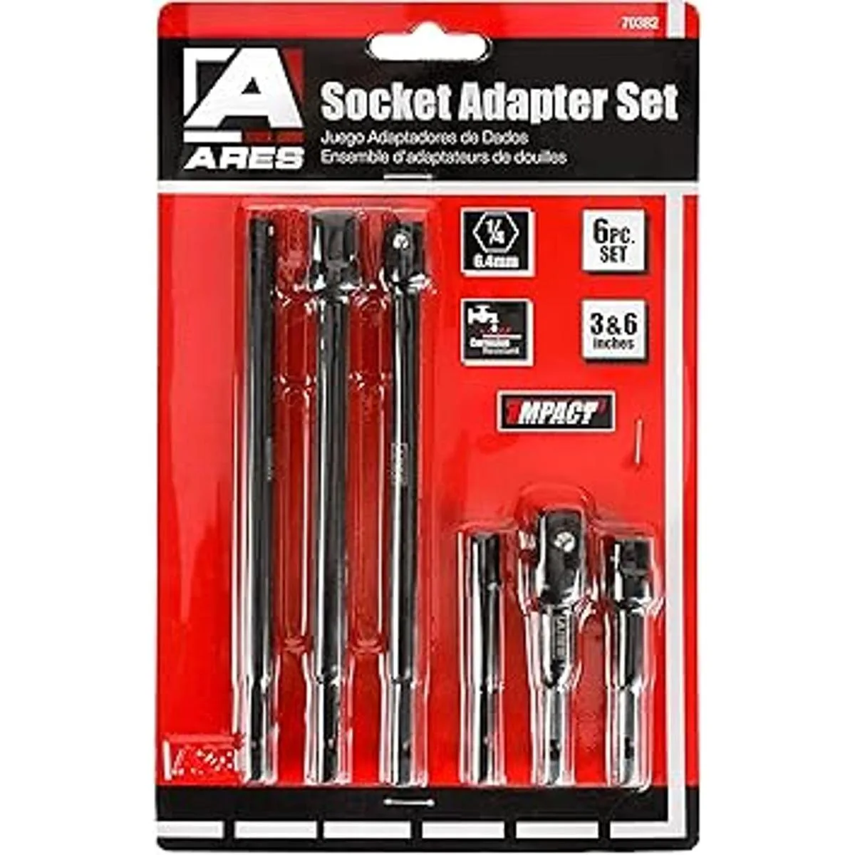 Especificaciones: este juego de adaptadores de enchufe de grado de impacto ARES viene con tres adaptadores de enchufe de 3 pulgadas de largo y tres adaptadores de enchufe de 6 pulgadas de largo en unidad de 1/4 pulgadas, unidad de 3/8 pulgadas y unidad de 1/2 pulgada con un vástago hexagonal de 1/4 pulgadas. Con estos adaptadores/extensiones, puedes convertir cualquier taladro de impacto en un controlador de enchufe con el alcance adicional que necesitas.