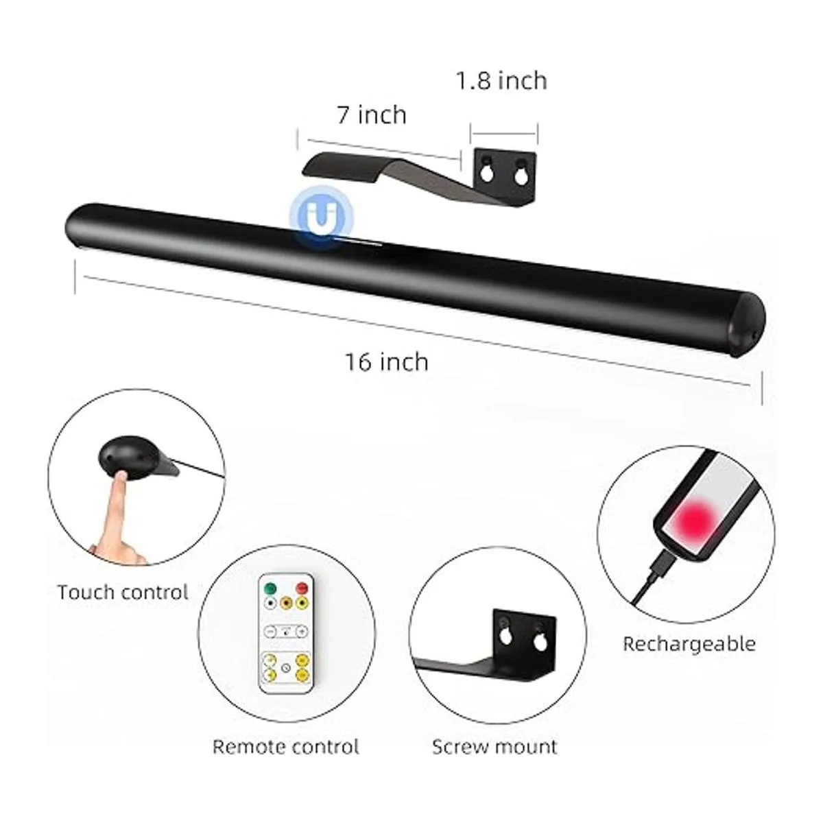 Especificaciones de la luz LED de arte 40 LED de 300 lúmenes súper brillantes, barra de luz de 16 pulgadas, soporte de montaje de 7 pulgadas, material de metal, cobertura de iluminación de 80 pulgadas de ancho, 3 colores de iluminación, brillo regulable, temporizador preestablecido, función de memoria, fijación magnética desmontable, recargable CC 5 V.